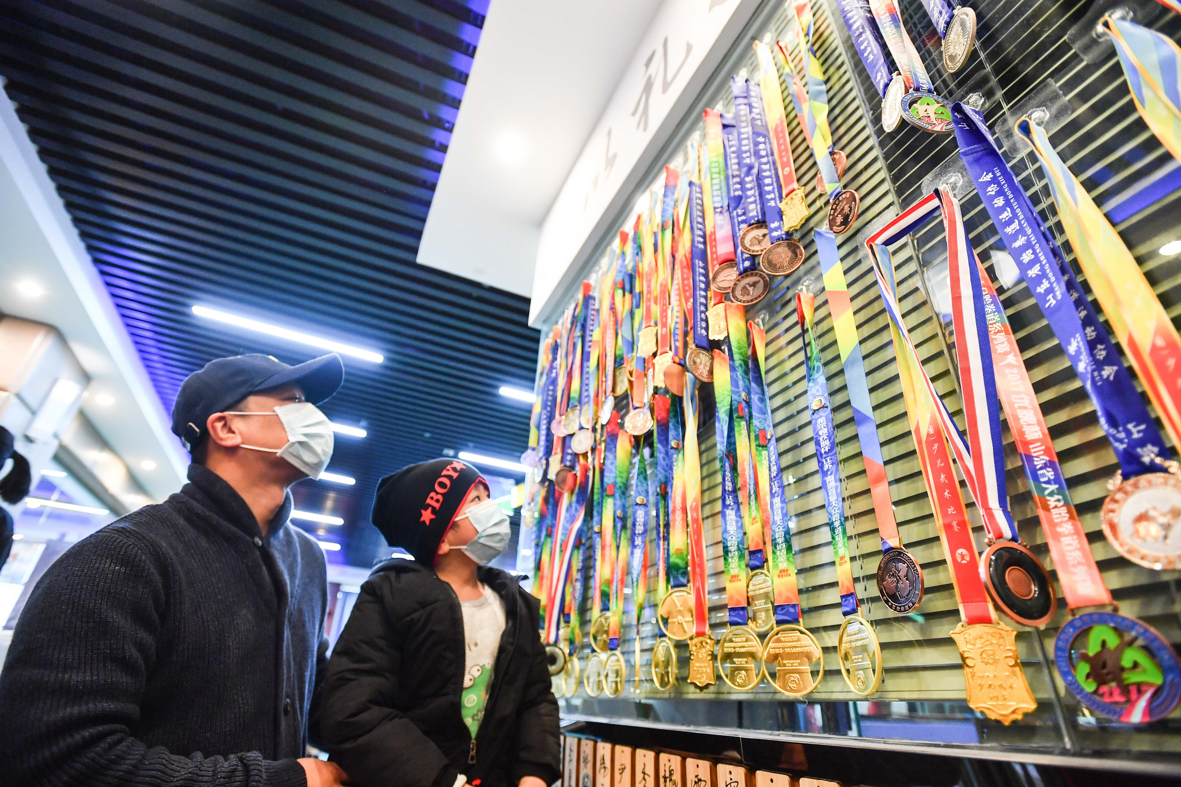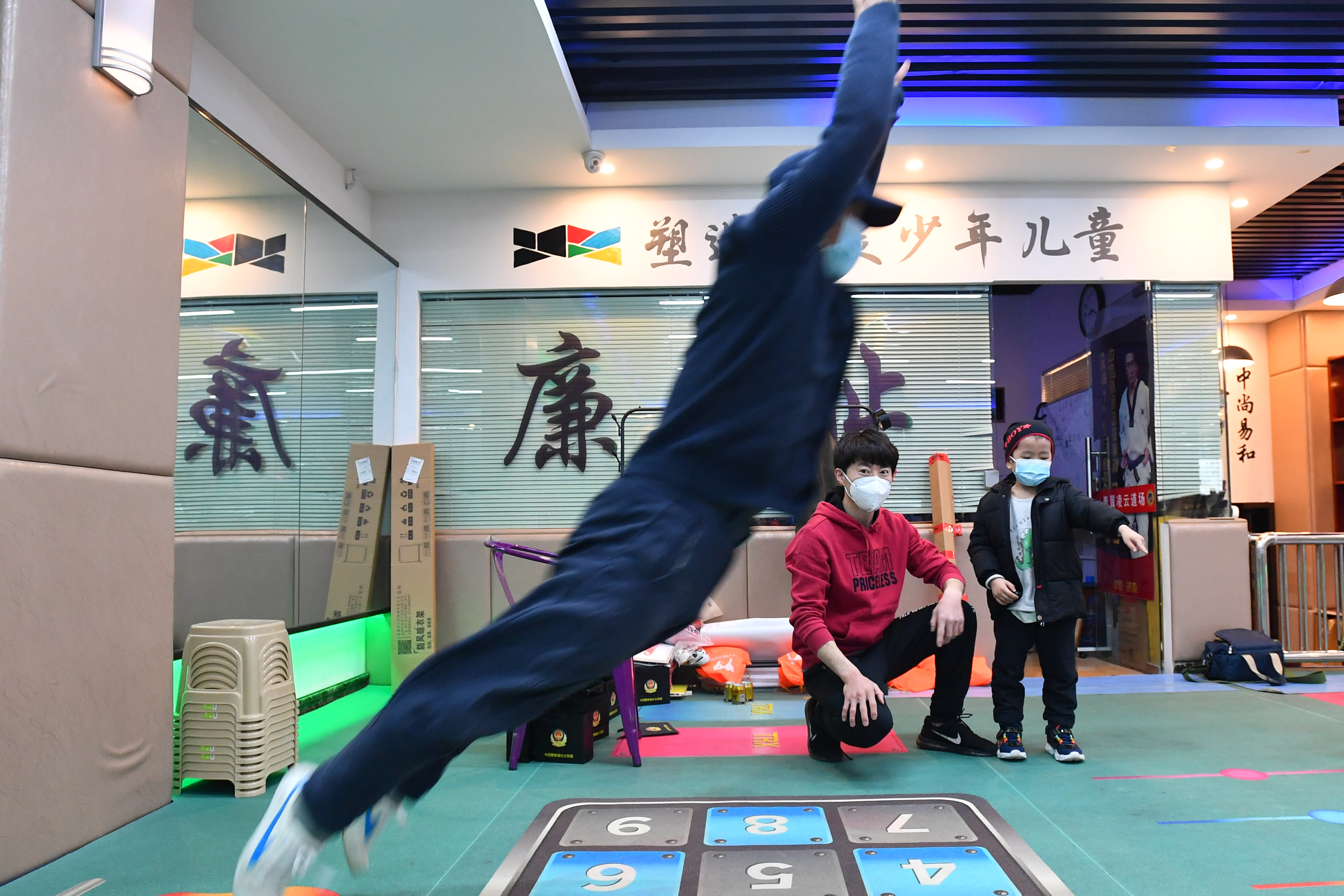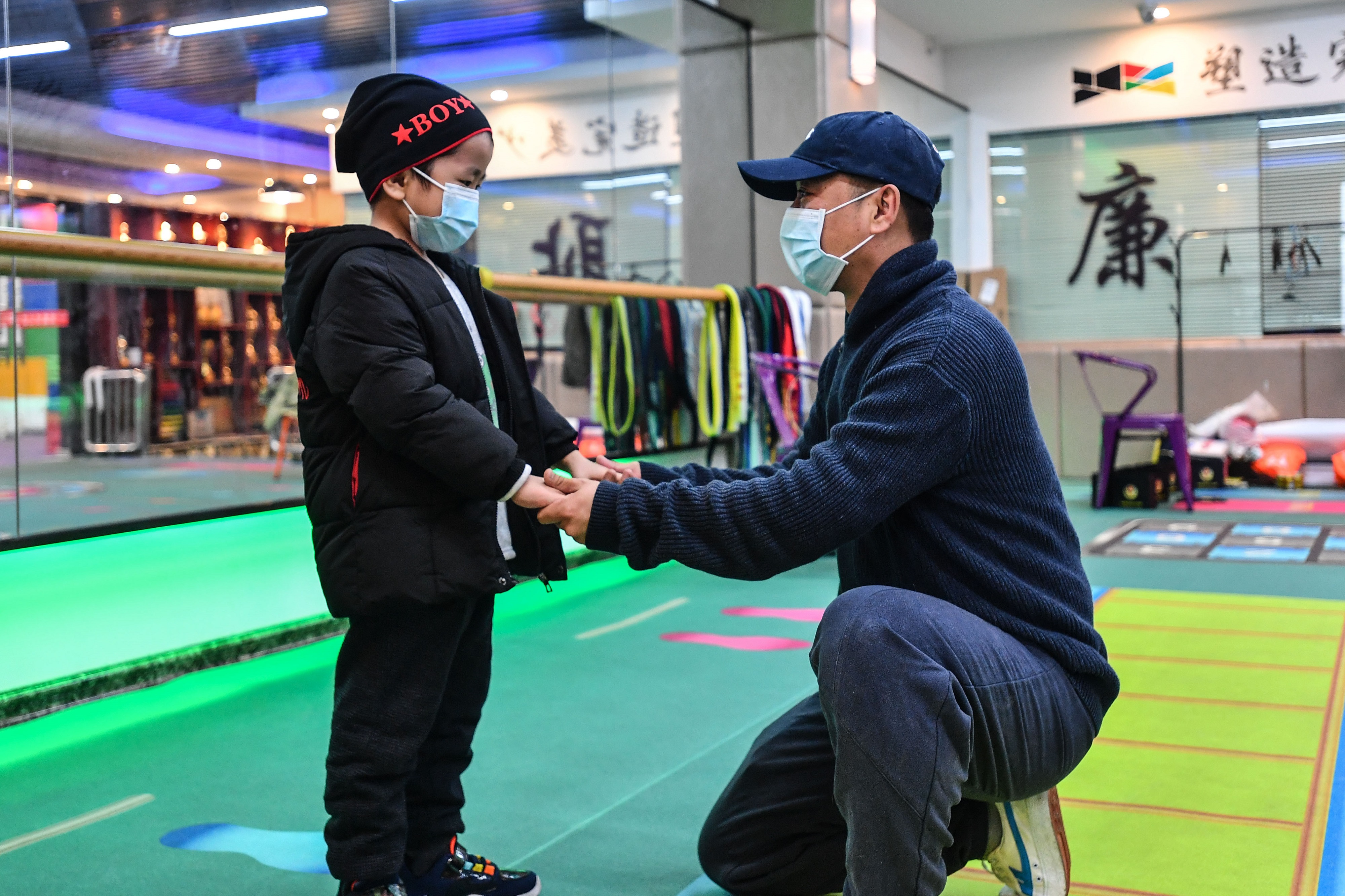 阳阳身着道馆为其定制的黑色跆拳道道服