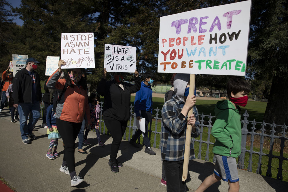 今年1月以来,美国针对亚裔的歧视行为和仇恨犯罪事件数量继续上升。图为2月27日,在美国加利福尼亚州旧金山湾区圣马特奥市,人们参加集会反对针对亚裔的歧视行为和仇恨犯罪。新华社发(李建国摄)