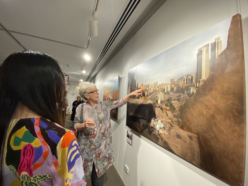 3月4日,悉尼中国文化中心主办的“自然·爱——中澳女艺术家对话展”在悉尼拉开帷幕。图为澳大利亚女艺术家安妮·扎哈尔卡为观众讲解自己的作品。(新华社记者郝亚琳摄)