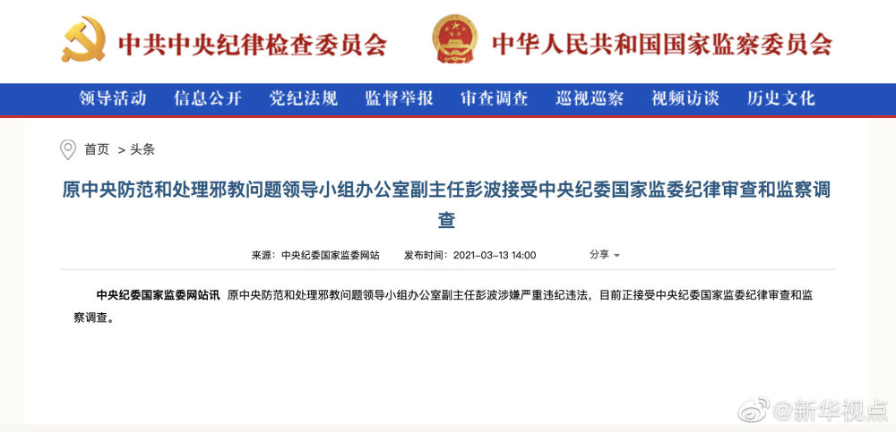 【原中央防范和处理邪教问题领导小组办公室副主任彭波接受中央纪委国家监委纪律审查和监察调查】原中央防范和处理邪教问题领导小组办公室副主任彭波涉嫌严重违纪违法,目前正接受中央纪委国家监委纪律审查和监察调查。