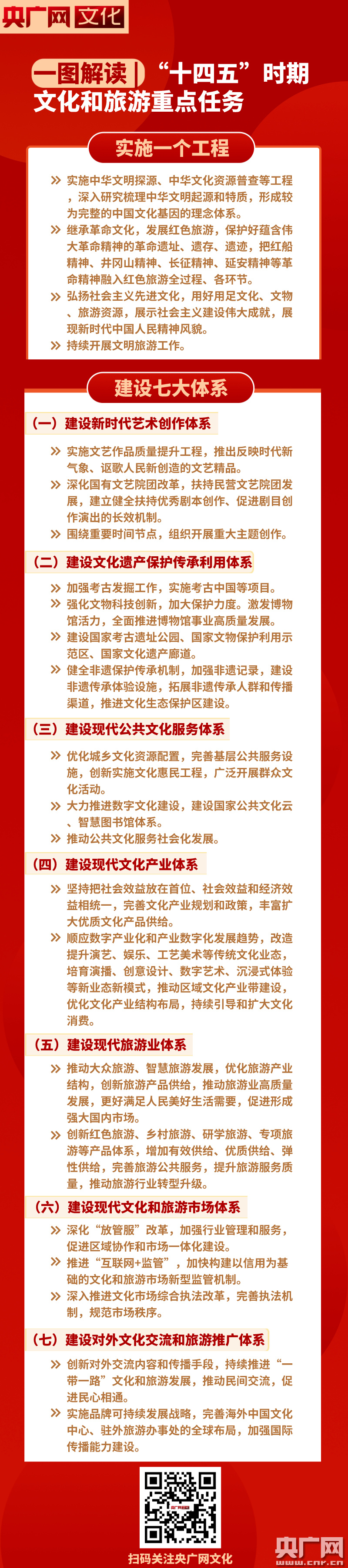近日,记者从文化和旅游部了解到,“十四五”时期,文化和旅游部将重点实施一个工程、建设七大体系,开创文化和旅游工作新局面。