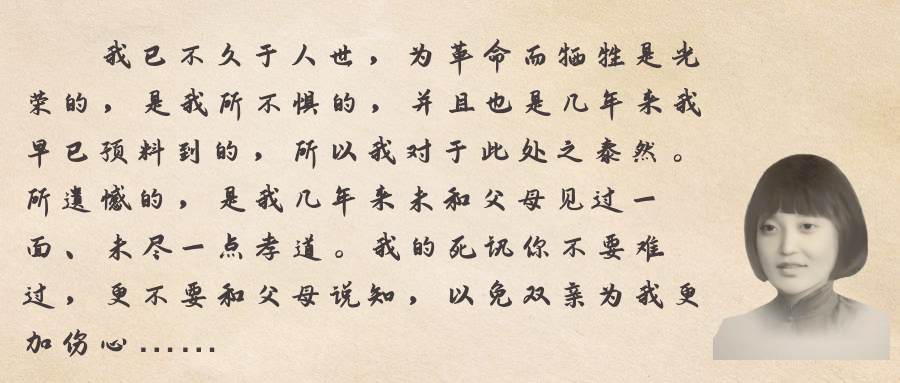 在他们的遗书中,二人分别写道:“你的父母是共产党员”“谁无父母,谁无儿女,谁无情人,我们正是为了救助全中国人民的父母和妻儿,所以牺牲了自己的一切”。