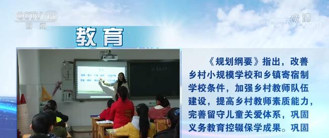 关于教育。《规划纲要》指出,改善乡村小规模学校和乡镇寄宿制学校条件,加强乡村教师队伍建设,提高乡村教师素质能力,完善留守儿童关爱体系,巩固义务教育控辍保学成果。巩固提升高中阶段教育普及水平,鼓励高中阶段学校多样化发展,高中阶段教育毛入学率提高到92%以上。规范校外培训。完善普惠性学前教育和特殊教育、专门教育保障机制,学前教育毛入园率提高到90%以上。高等教育毛入学率提高到60%。分类建设一流大学和一流学科,支持发展高水平研究型大学。建设高质量本科教育,推进部分普通本科高校向应用型转变。