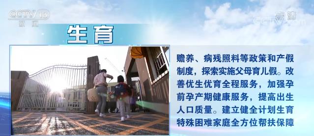 再就是生育。《规划纲要》规定,增强生育政策包容性,推动生育政策与经济社会政策配套衔接,减轻家庭生育、养育、教育负担,释放生育政策潜力。完善幼儿养育、青少年发展、老人赡养、病残照料等政策和产假制度,探索实施父母育儿假。改善优生优育全程服务,加强孕前孕产期健康服务,提高出生人口质量。建立健全计划生育特殊困难家庭全方位帮扶保障制度。改革完善人口统计和监测体系,密切监测生育形势。深化人口发展战略研究,健全人口与发展综合决策机制。