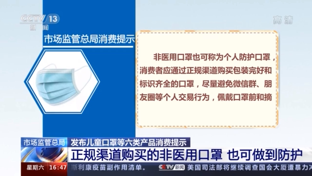 非医用口罩也可称为个人防护口罩,消费者要通过正规渠道购买包装完好和标识齐全的口罩,尽量避免微信群、朋友圈等个人交易行为。佩戴口罩前和摘下口罩后,均应及时洗手或使用酒精类洗手液搓手。口罩不宜长时间佩戴,如果口罩出现脏污、变形、损坏、有异味时,需及时更换。