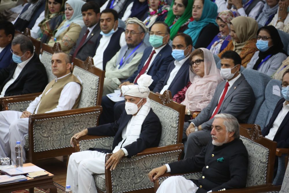 2020年8月7日,阿富汗总统加尼(前中)出席在喀布尔举行的大支尔格会议。会议就是否释放约400名有争议的塔利班在押人员做出决定。(新华社发,拉赫马图拉摄)