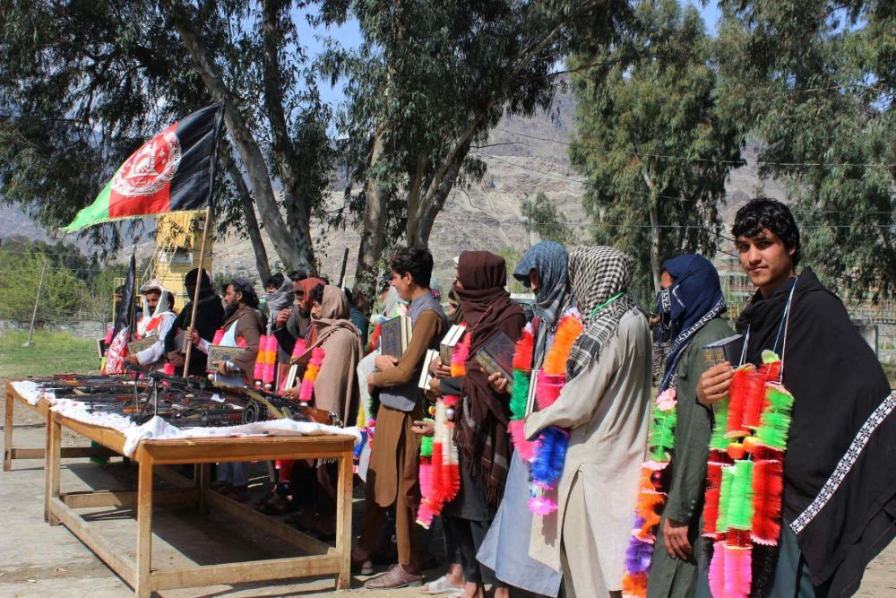 3月10日,20名塔利班武装人员在阿富汗库纳尔省阿萨达巴德参加投降仪式。(新华社发,埃姆兰·瓦克 摄)