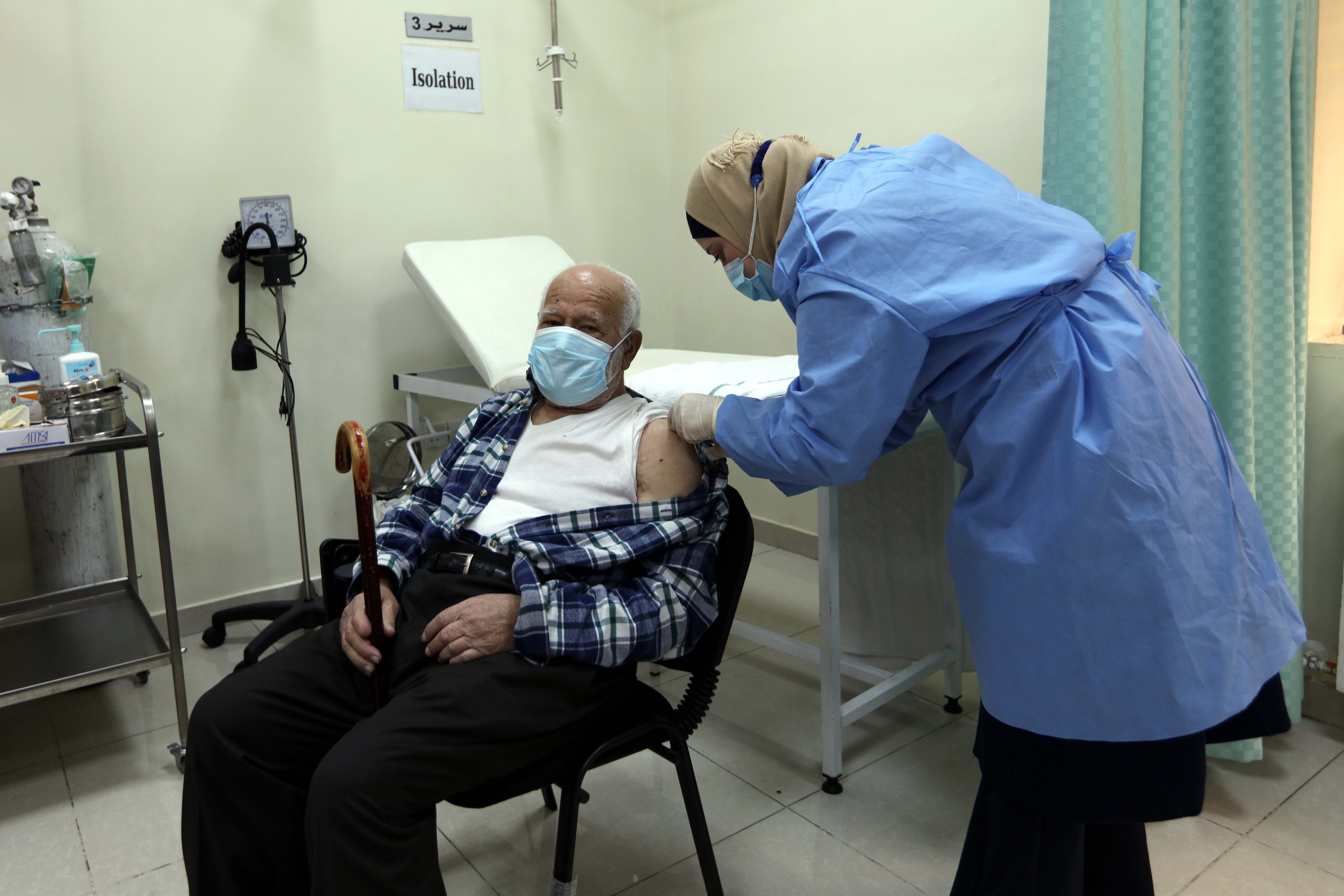 1月13日,在约旦首都安曼,一名老人在接种新冠疫苗。约旦当日起在全国范围内展开新冠疫苗接种工作,首批接种对象主要为防疫工作人员、老年人和慢性病患者。(新华社发,穆罕默德·阿布·古什摄)