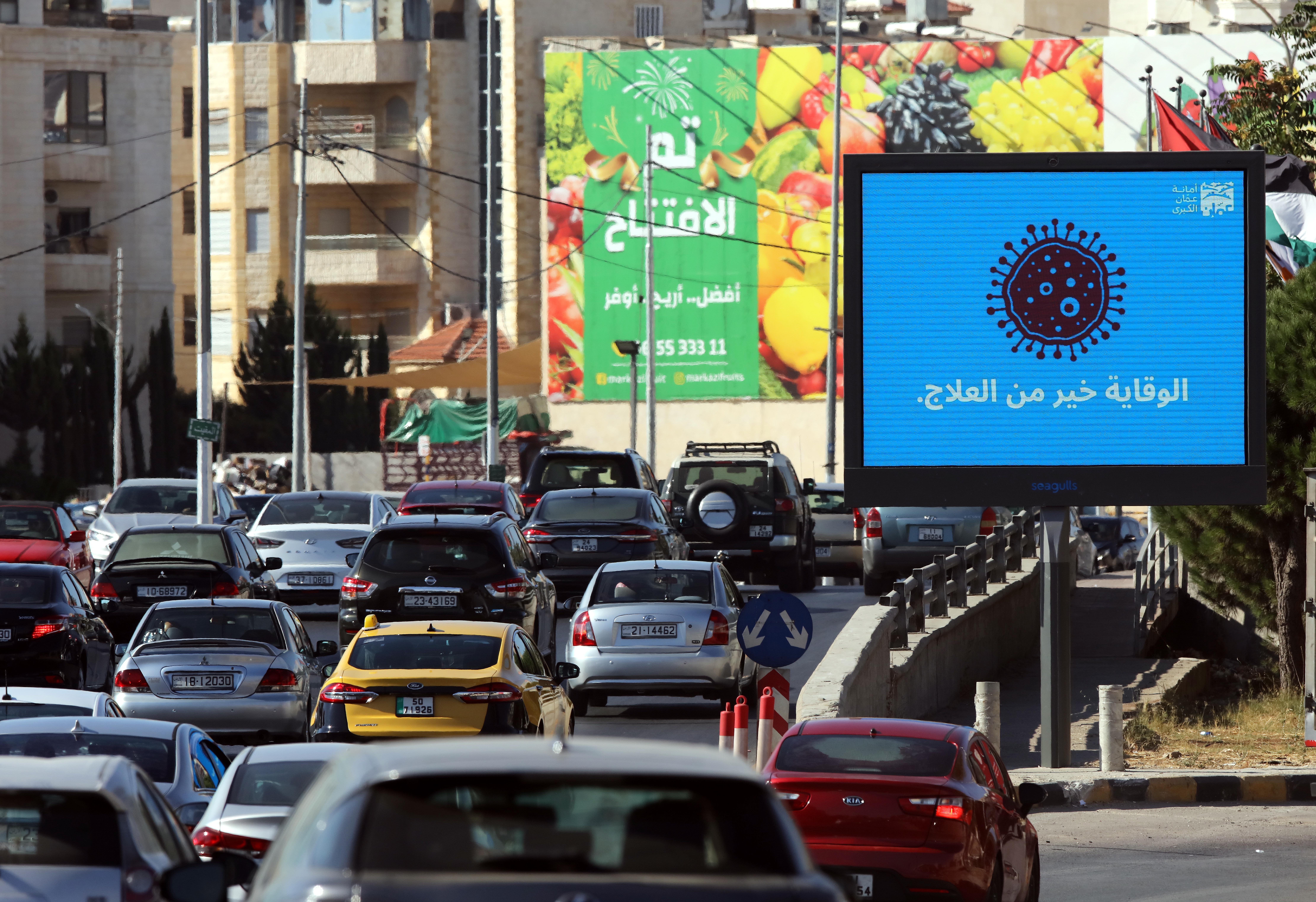 2020年8月26日,约旦首都安曼的一块户外屏幕显示“预防胜于治疗”的字样。(新华社发,穆罕默德·阿布·古什摄)