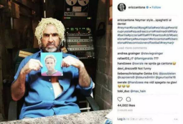 一脸正经的坎通纳拿着内马尔新发型的照片