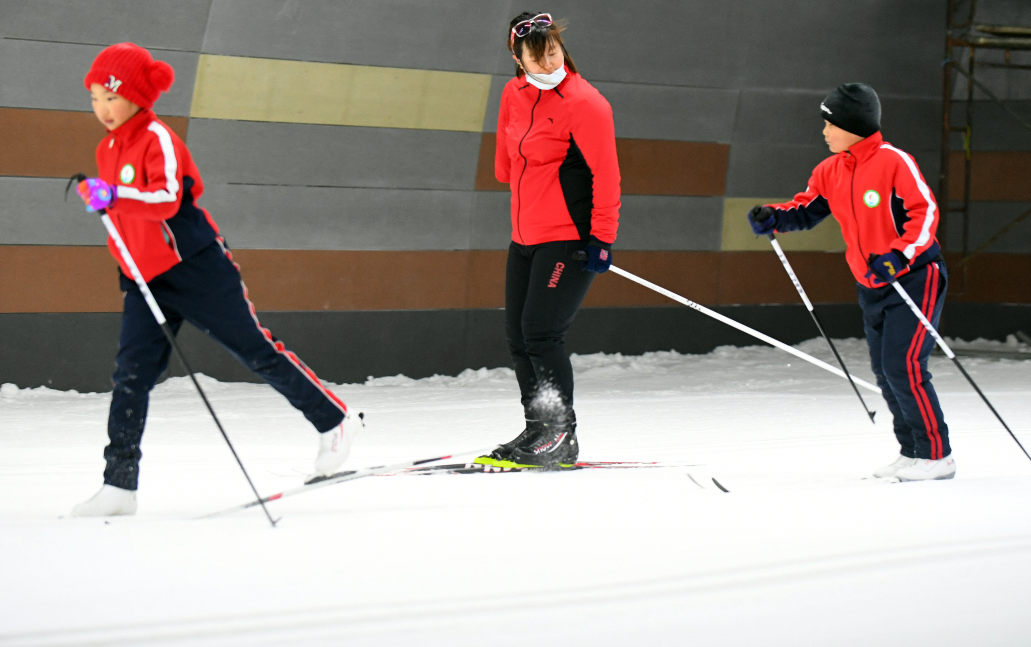 图为3月5日,在吉林市北山四季越野滑雪场,冬残奥教练员彭园园(中)指导小运动员越野滑雪技巧。新华社记者 林宏 摄