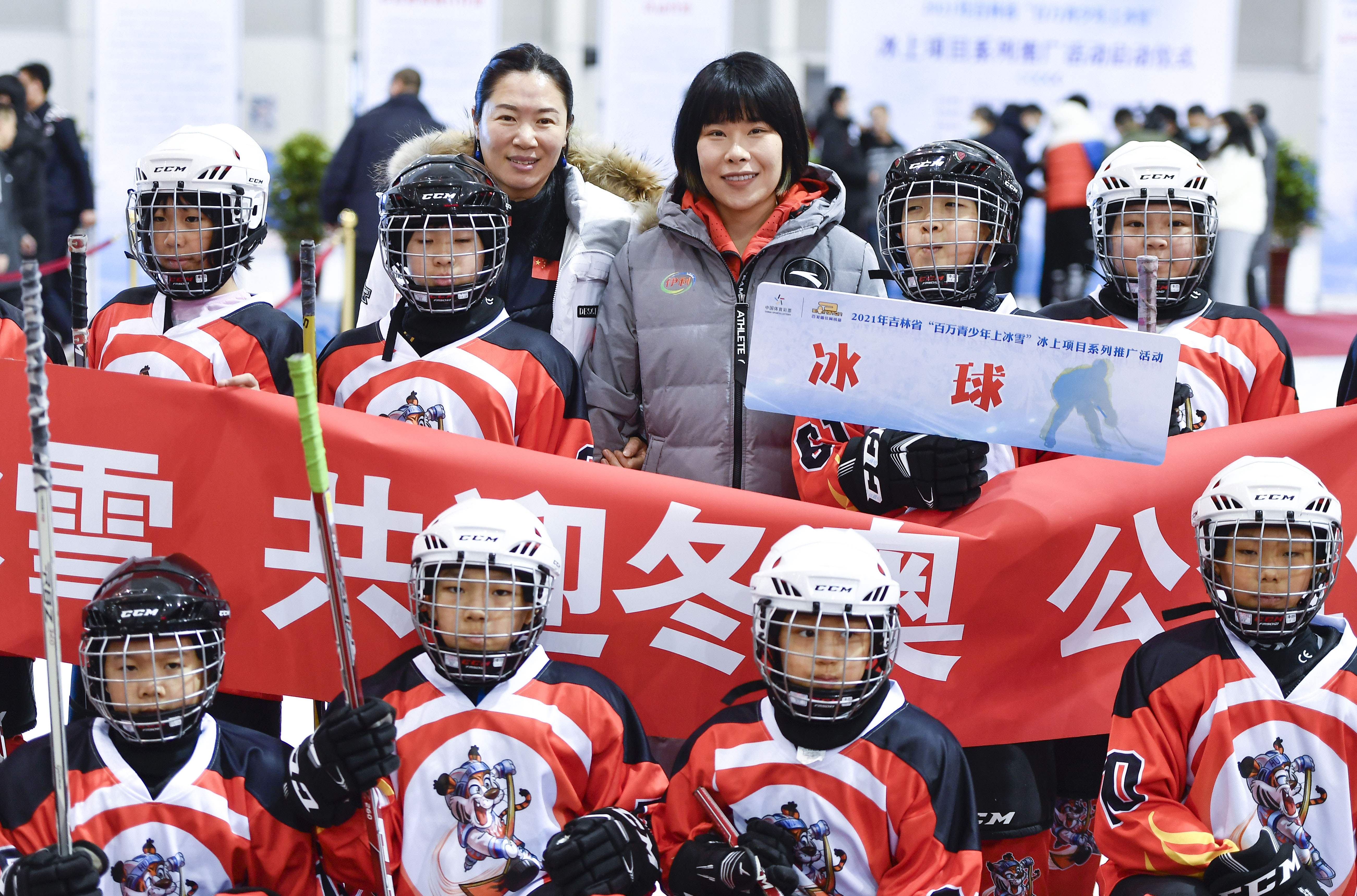 图为3月7日,冬奥会短道速滑冠军周洋(后右三)在启动仪式上与冰球小选手们合影留念。新华社记者 许畅 摄