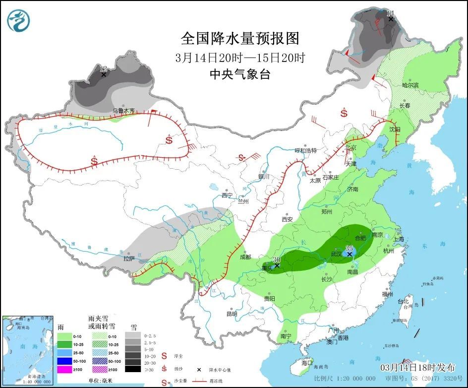 14日20时至15日20时,内蒙古东部、黑龙江中部和西部、吉林大部、新疆北部、西藏东部、青海南部、川西高原北部等地部分地区有小雪或雨夹雪。黑龙江西部、辽宁中部和东部、西藏东南部、华北东部和南部、黄淮、江淮、江汉、江南北部和西部、川西高原中南部、西南地区东部、华南北部等地部分地区有小到中雨,局地大雨。