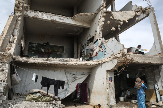 △2020年4月伊德利卜省,一名流离失所的叙利亚妇女带着两个孩子找了一处濒临倒塌的危房生活。