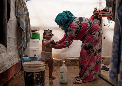 △叙利亚北部一名母亲正在给孩子洗澡,在当地,土耳其及其支持的反对派武装时常切断。