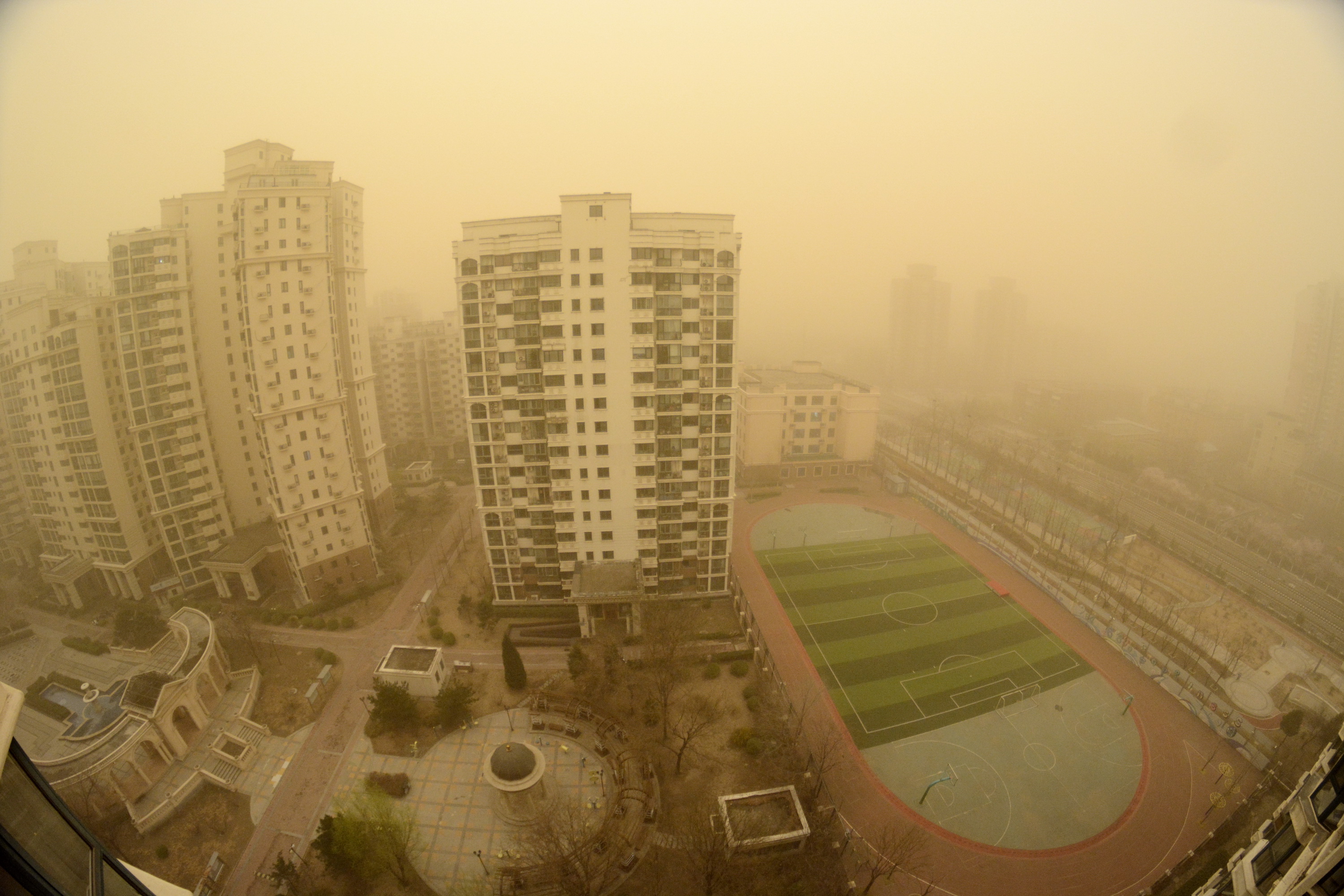 图为3月15日,沙尘笼罩下的北京市朝阳区一处住宅小区。新华社记者李欣摄
