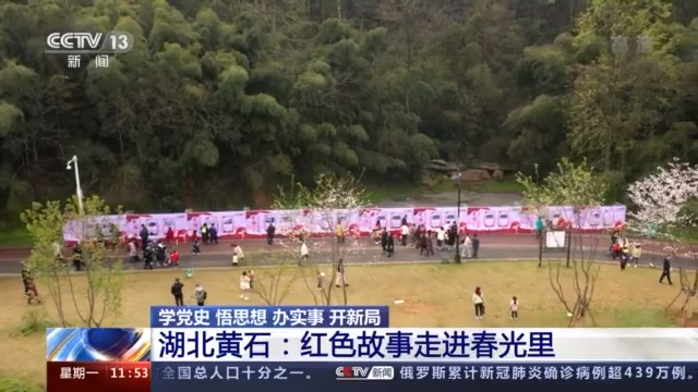 这两天,在湖北黄石磁湖公园,山樱花、垂枝大叶早樱等7个品种的5000株樱花,在青山碧水间争奇斗艳。在这美丽的春色里,当地把党史教育也搬到了户外,在2.4公里的樱花带上,引入红色故事和红色文化,沿途的展板,展示从中共一大到十九大的发展历程,人们漫步其中,重温峥嵘岁月、感悟信仰力量。