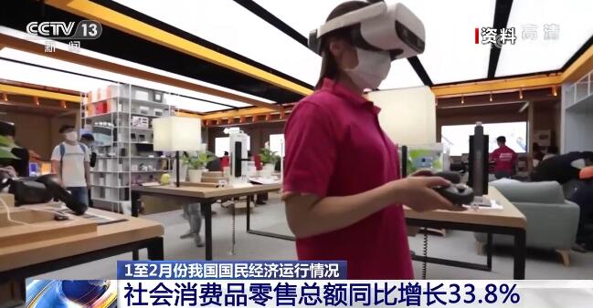在消费方面,市场销售保持增长。1—2月份,社会消费品零售总额69737亿元,同比增长33.8%,比2019年1—2月份增长6.4%,两年平均增长3.2%。其中,多数商品销售增势良好,网上零售也持续增加。