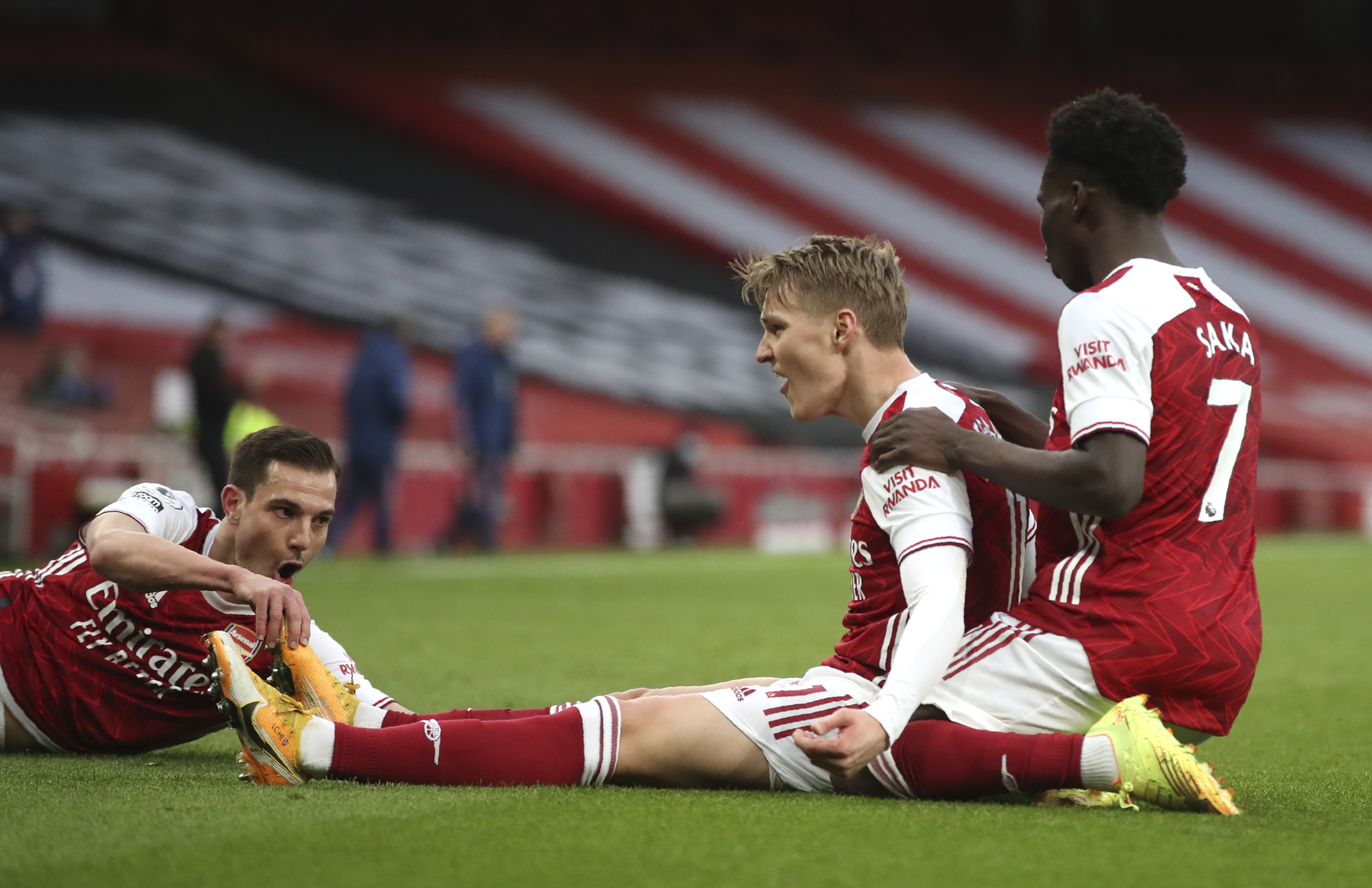 图为3月14日,阿森纳队球员厄德高(中)庆祝进球。新华社/美联