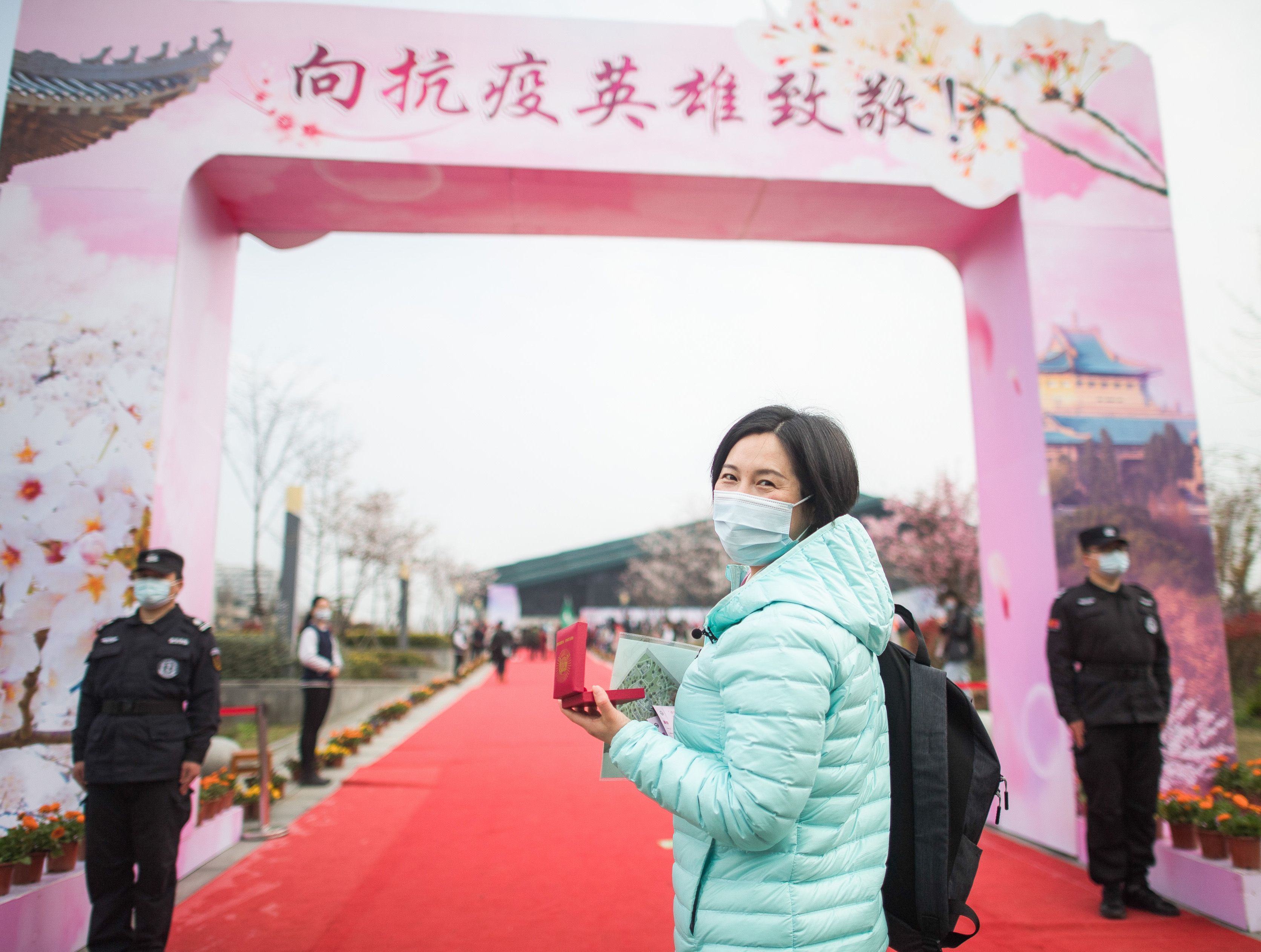↑3月13日,周国红准备参加在武汉大学举办的援鄂抗疫医护人员赏樱专场欢迎仪式。新华社记者 肖艺九 摄