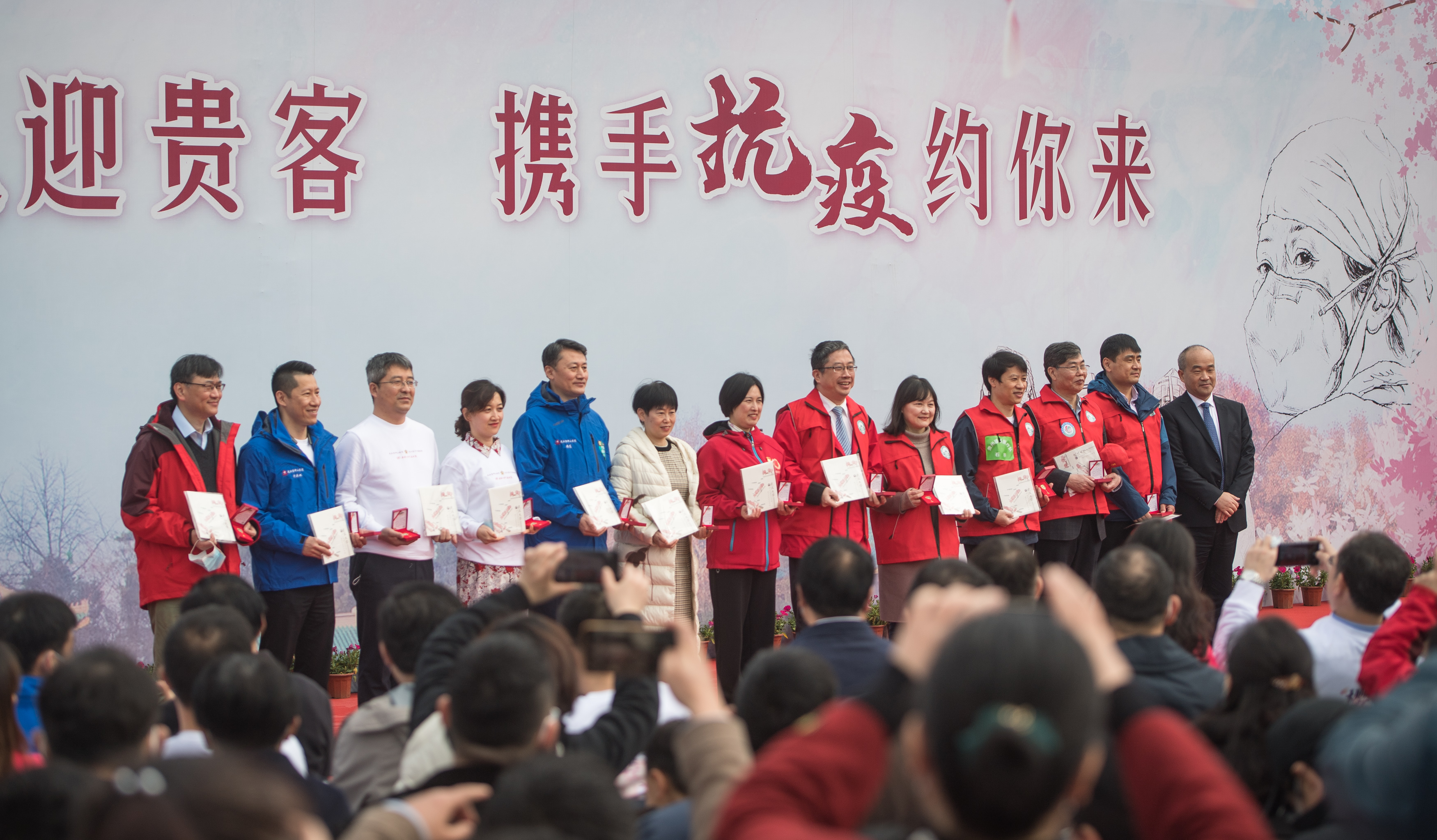 ↑3月13日,武汉大学志愿者为周国红(前右二)等援鄂医疗队员介绍武汉大学历史。新华社记者 肖艺九 摄