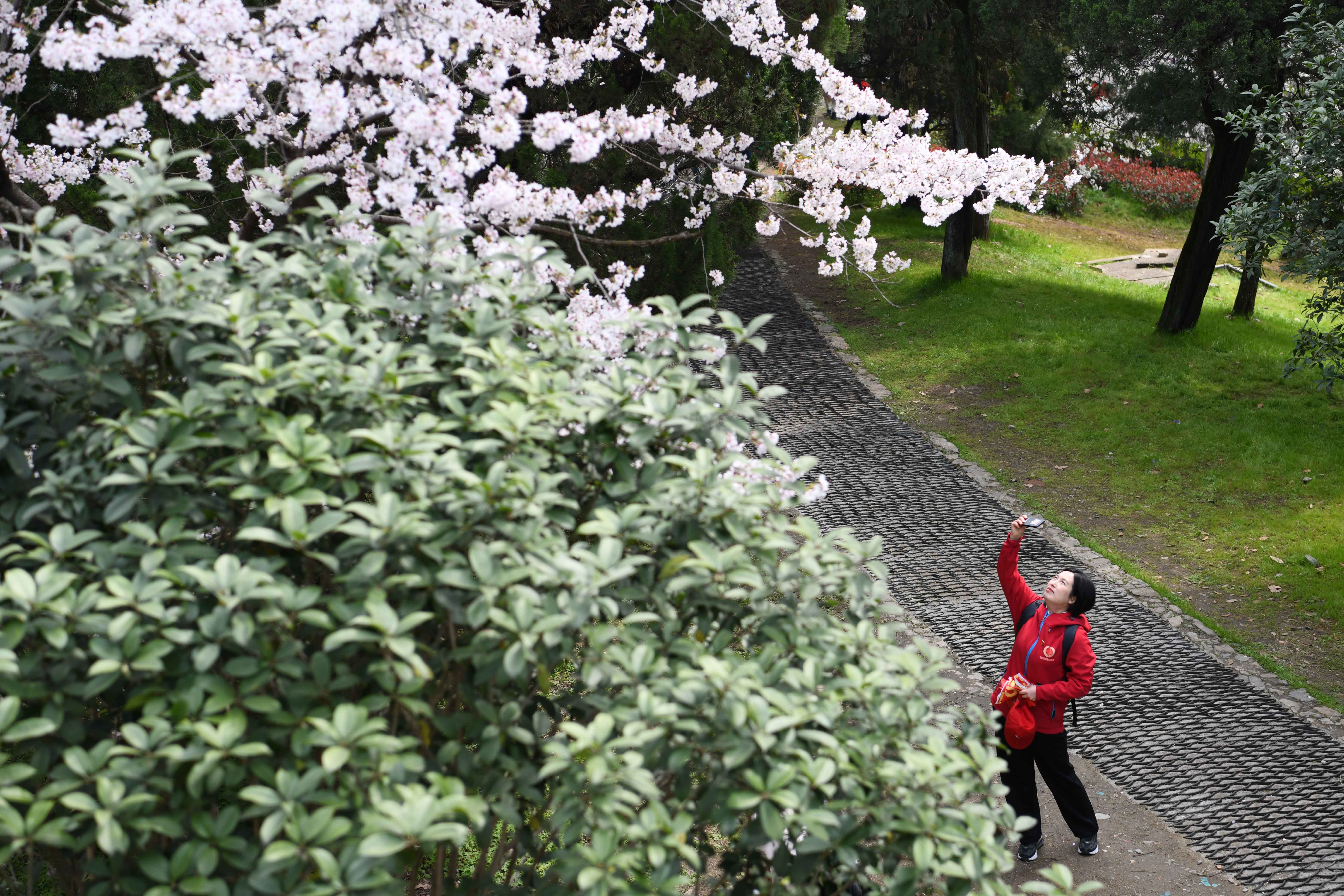 ↑3月13日,周国红在武汉大学樱花树下拍照。新华社记者 肖艺九 摄