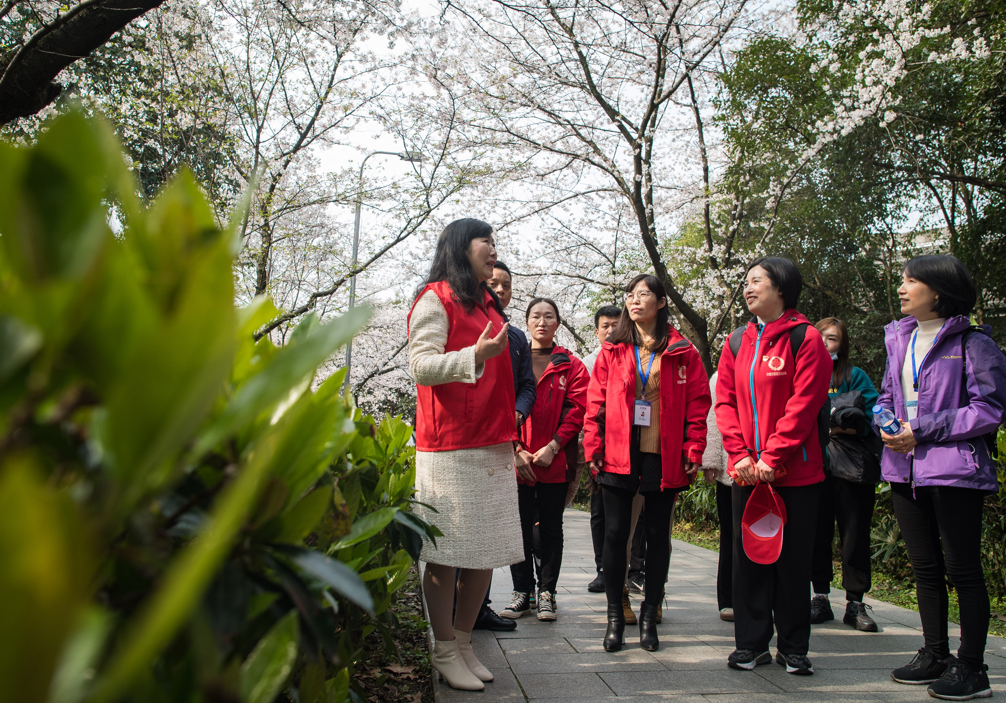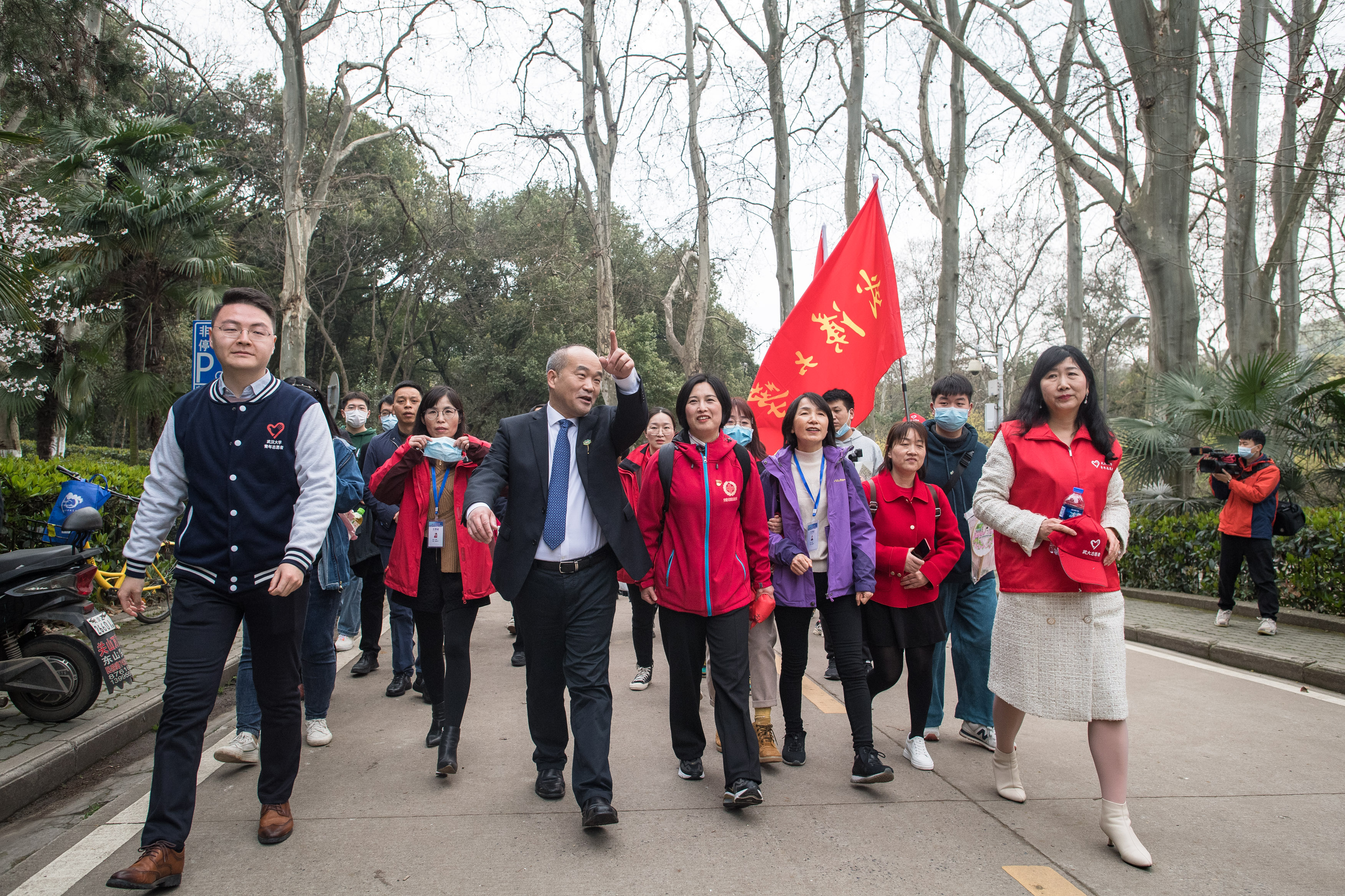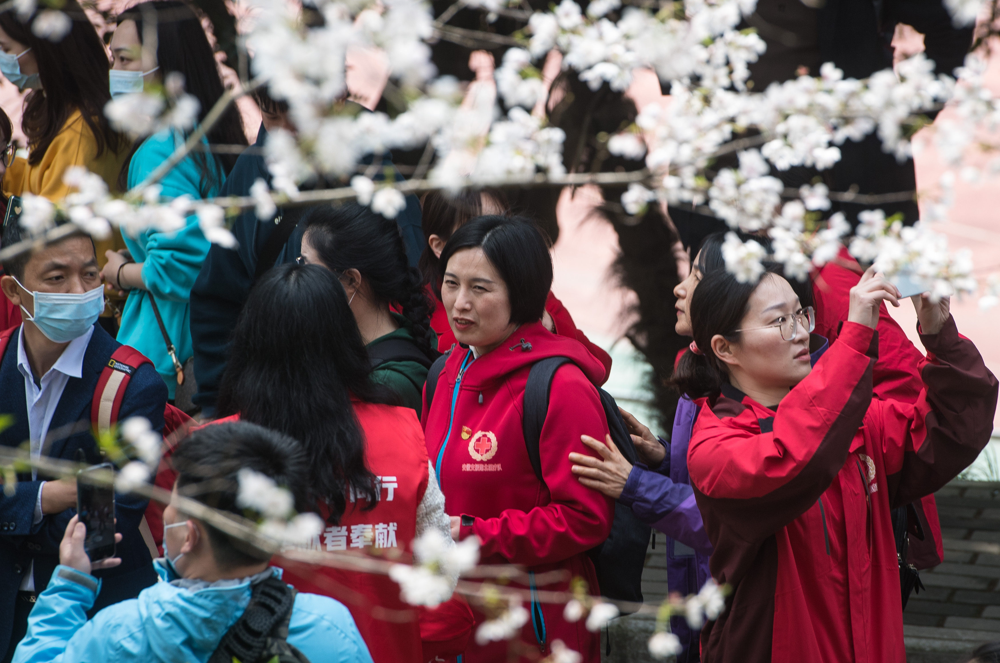 ↑3月13日,周国红(前排左二)在武汉大学樱花大道参观。新华社记者 肖艺九 摄