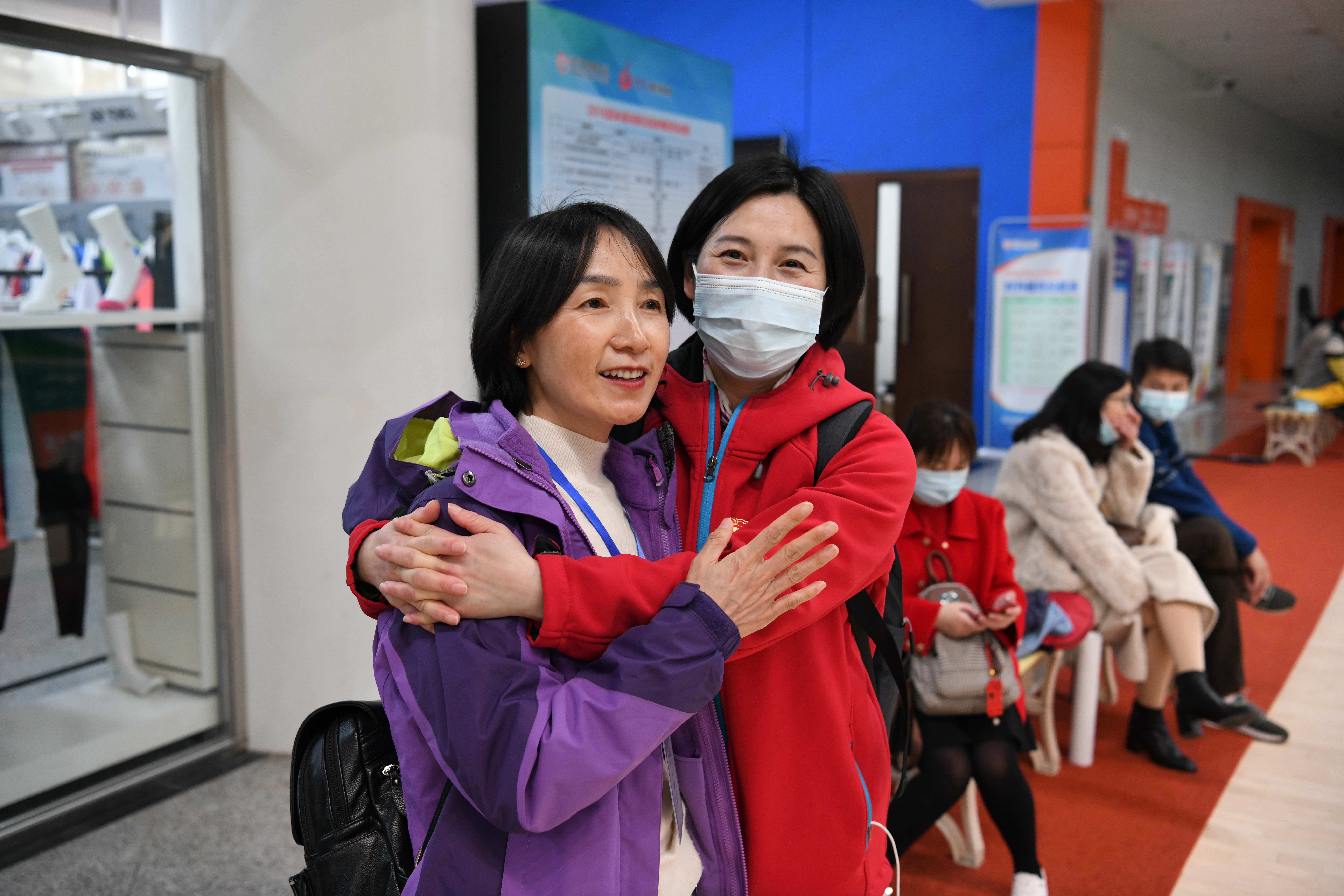 ↑3月13日,周国红(前右)在武汉体育中心内。这里曾作为方舱医院使用。新华社记者 张端 摄