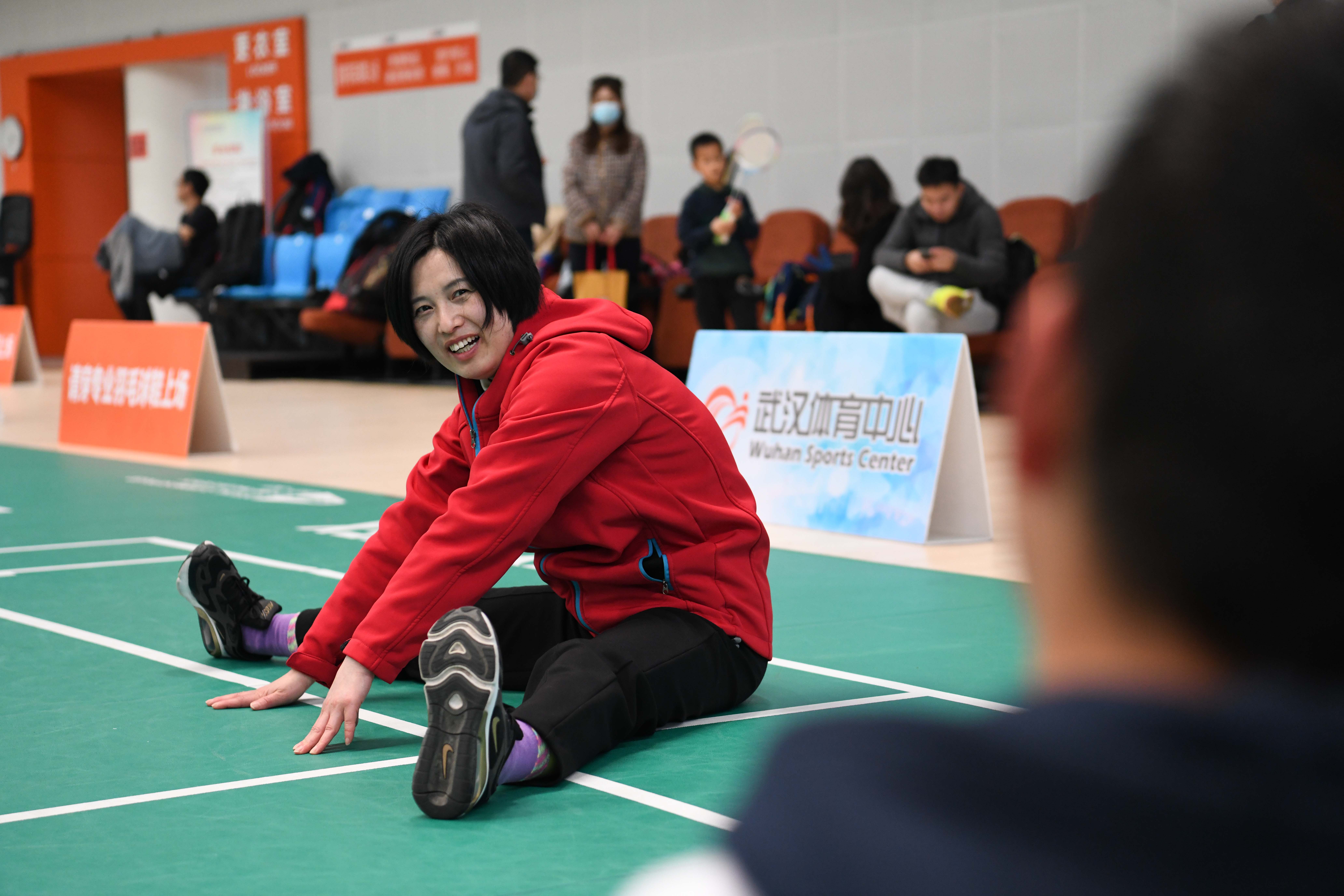 ↑3月13日,在武汉体育中心内,周国红与一名正在进行体育锻炼的孩子交流。这里曾作为方舱医院使用。新华社记者 张端 摄