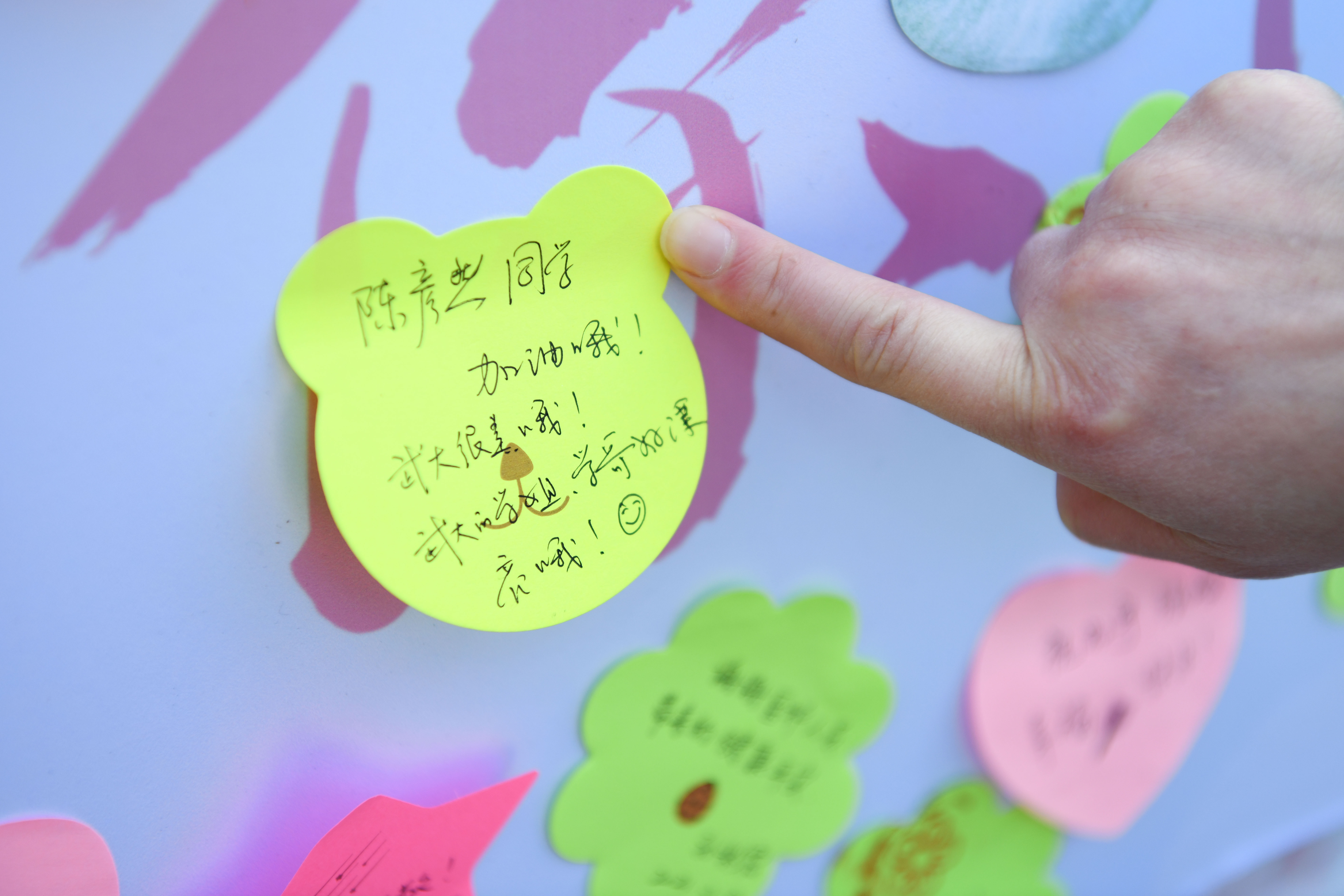 ↑3月14日,在武汉大学校园内,周国红在便利贴上写下自己对女儿陈彦然的期望。新华社记者 张端 摄