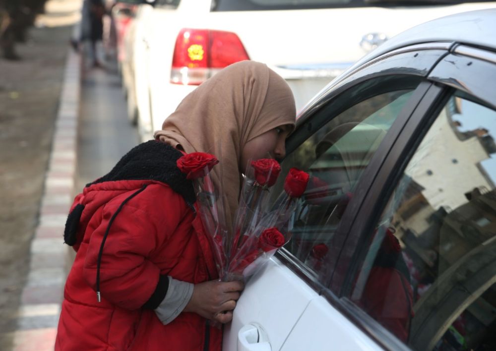 2月14日,一名女孩在阿富汗喀布尔的街道上兜售玫瑰花。(新华社发,拉赫马图拉·阿里扎达摄)