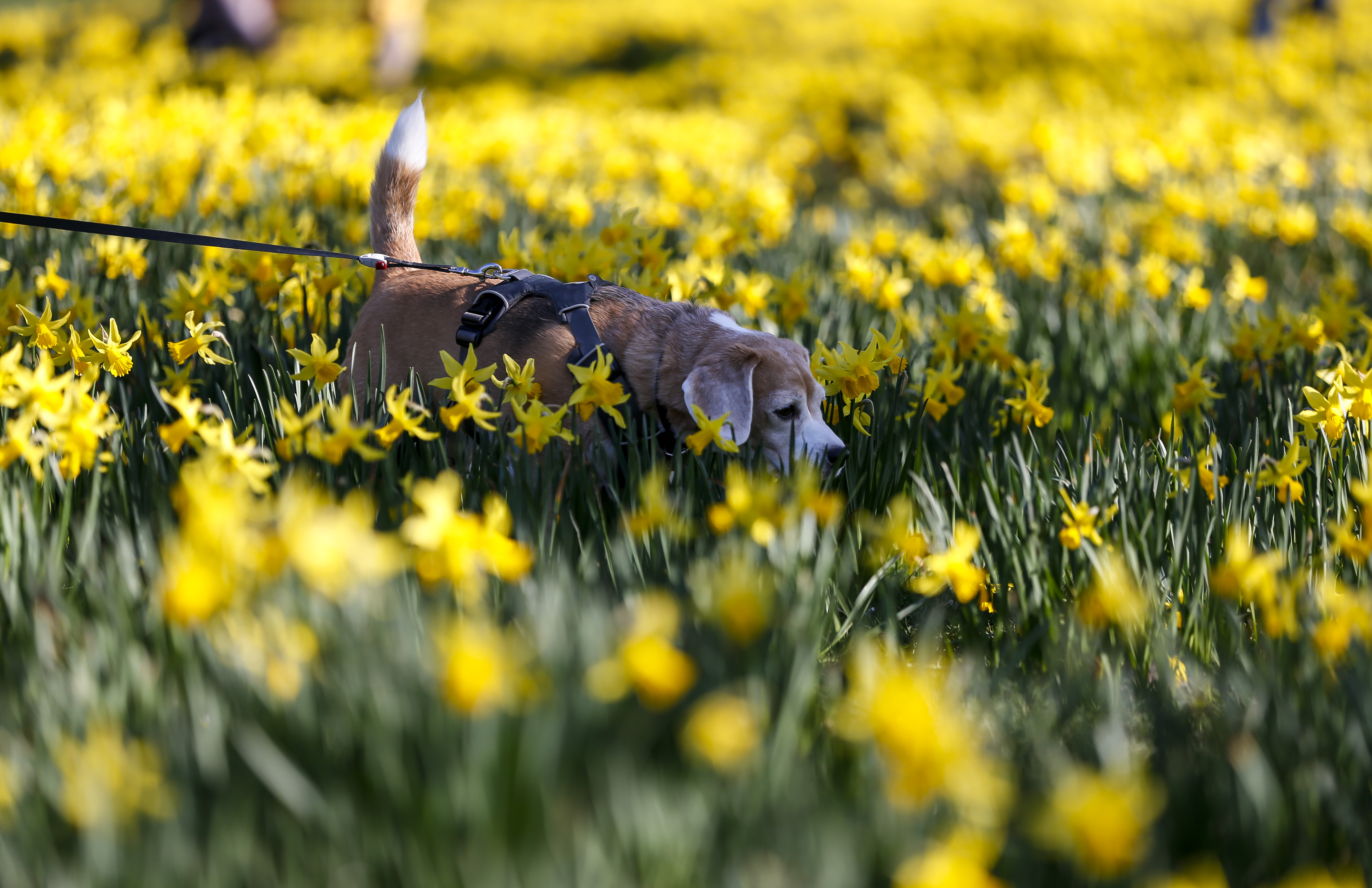 2月26日,一只狗在英国伦敦圣詹姆斯公园的花丛中玩耍。(新华社记者韩岩摄)