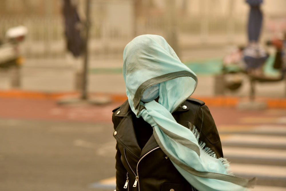 ↑3月15日,在北京市东四环外朝阳路,行人脸上蒙着纱巾出行。新华社记者 鞠焕宗 摄