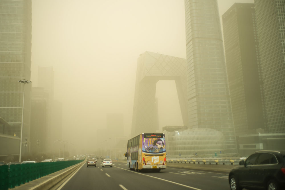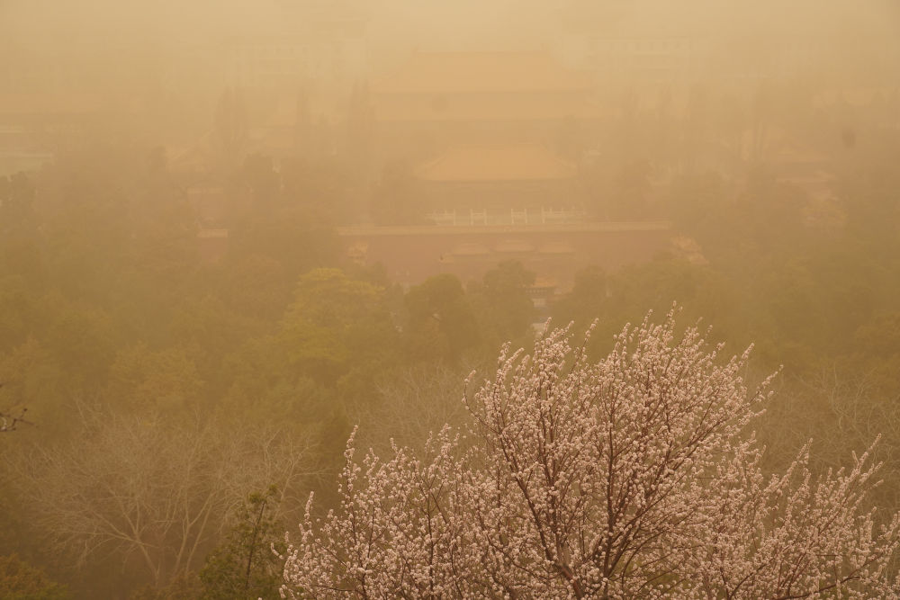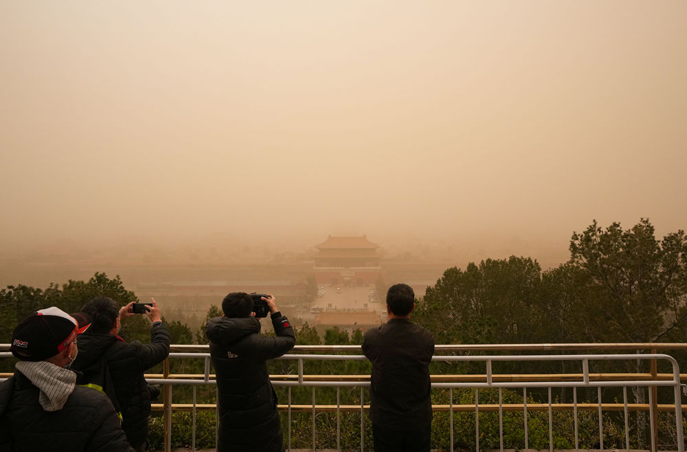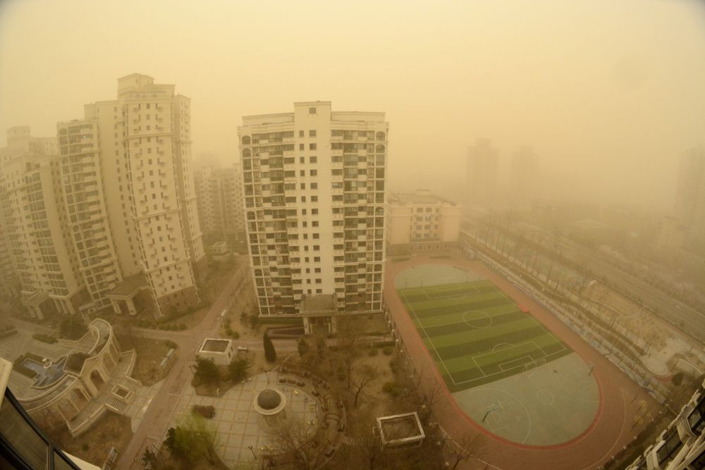 ↑3月15日拍摄的沙尘笼罩下的北京市朝阳区一处小区。新华社记者 李欣 摄