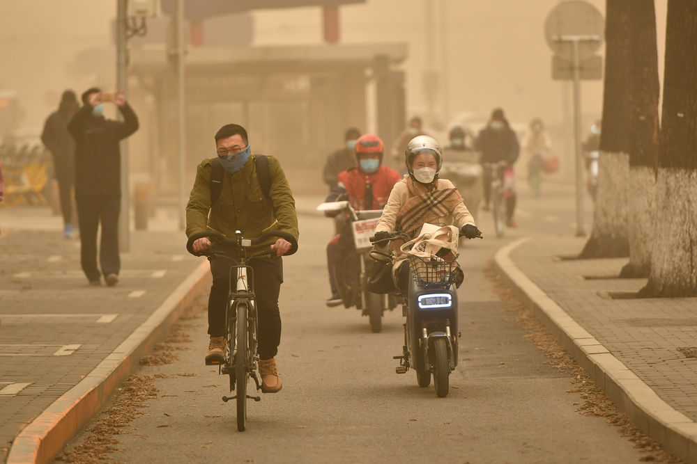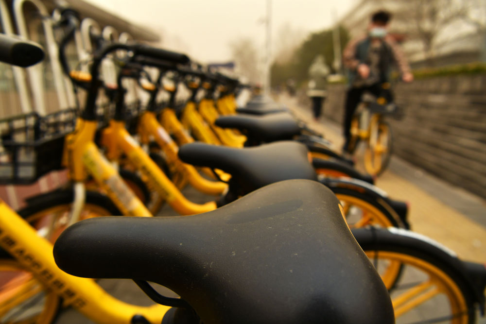 ↑北京宣武门路口停放的共享单车上能看到明显的沙尘(3月15日摄)。新华社记者 李鑫 摄