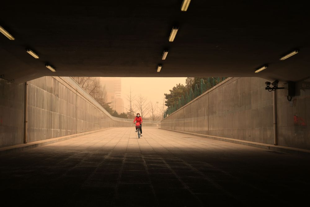 ↑3月15日,市民在北京长安街一处地下通道骑车。新华社记者 金良快 摄