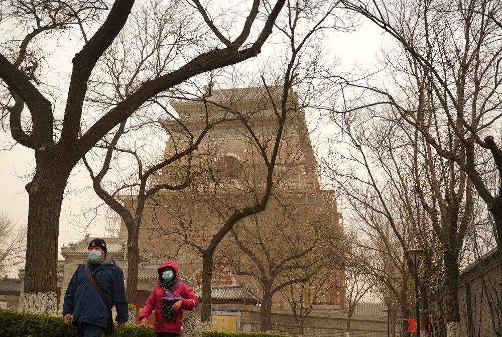 ↑3月15日,市民从北京钟楼下走过。新华社记者 贾浩成 摄