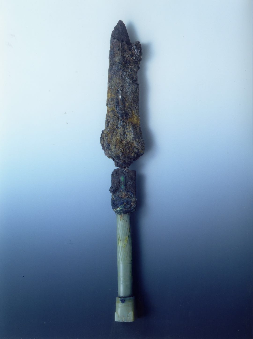 为慎重起见,考古专家暂停了对此物的清理,先清理周边的青铜器、兵器。两天后,再对其进行重点清理。专家们发现,玉圆柱下面的铁虽然整体断裂,但中间还有很细很细的部分连在一起。铁锈上能看到丝绢包裹后留下的痕迹。器物尖端因插在木椁里,阻止了氧化,留下一个宝贵而完整、看上去锐不可当的锋!这时专家们才明白,这是一把玉柄铁剑,与车马器、兵器放在一块儿,非常合适。