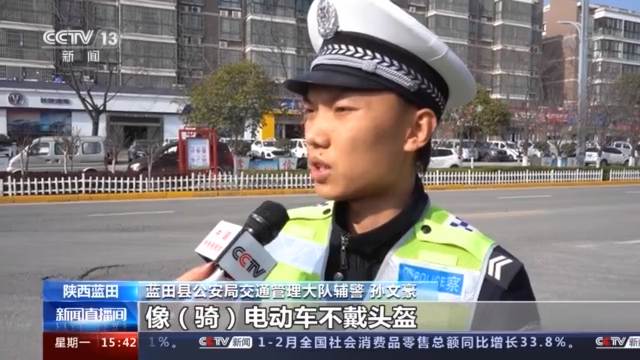 蓝田县公安局交通管理大队辅警 孙文豪:主要是让他们看到路面上基本的一些交通违法的不安全因素,像电动车不戴头盔、不系安全带等这一系列违法行为。
