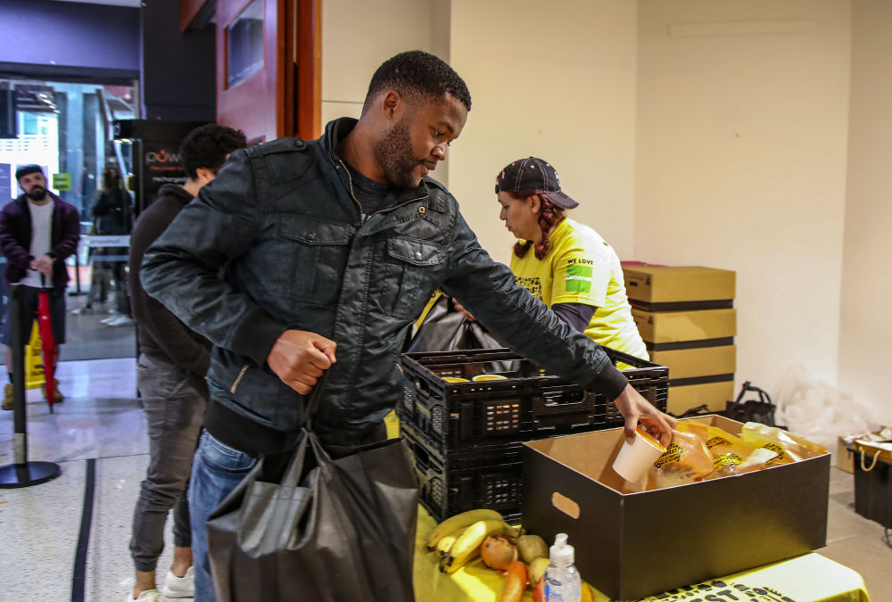 2020年5月21日,在澳大利亚悉尼环形码头,海外留学生领取救济食品。当日,悉尼市政府向受疫情影响的海外留学生和临时签证持有者发放救济食品。(新华社记者白雪飞摄)