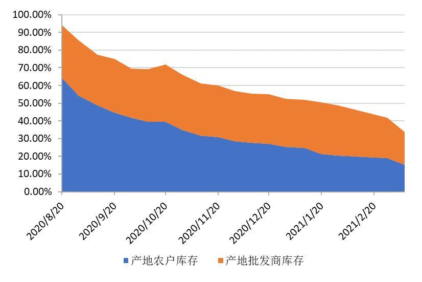 自2020年新花椒采收上市以来,武都、汉源、韩城等产地的花椒库存呈现稳步下降趋势,产地农户和产地批发商库存百分比从2020年8月中下旬的94.23%下降到2021年3月上旬的33.73%,产地现有库存已处于较低水平。其中,产地农户库存降幅最为明显,半年多来,武都、汉源等7大花椒产地的农户库存均值下降了49个百分点,截至3月10日,产地农户库存百分比均值约15.26%。据陇南市瑞达花椒专业合作社负责人反馈,2020年新花椒丰产叠加2019年较多的剩余库存,给2020年花椒销售带来不小压力,但2020年至今产地走货较为顺畅,目前库存降幅好于预期。
