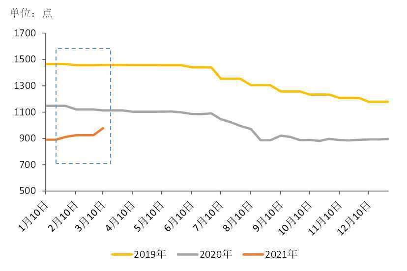 2020年全国花椒总体增产明显,叠加疫情影响,2020年7月新椒上市后,价格持续下滑,新华·中国(武都)花椒价格指数于10月中下旬跌至近三年来最低点,随后花椒价格企稳,保持平稳震荡。2021年1月下旬以来,全国花椒价格开始快速回升,打破了2019年和2020年连续两年同期下跌的趋势。截至3月10日,新华·中国(武都)花椒价格指数较去年最低点(2020年10月20日)上涨96.89点,涨幅达10.96%。
