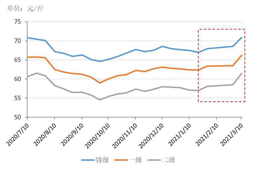 以武都产区为例,自2020年9月30日跌至最低点后,武都花椒批发价格率先震荡回升,并于2021年1月底开始加速上涨。截至3月10日,武都特级、一级和二级花椒批发价格分别报70.88元/斤、66.23元/斤和61.46元/斤,较最低点时上涨6.25-7.25元/斤,平均涨幅9.68%-12.72%,武都花椒批发价格已恢复至2020年7月初的水平。