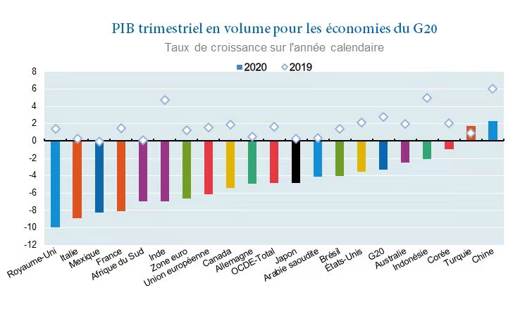 当地时间3月15日,总部位于巴黎的经济合作与发展组织(OECD)发布的数据显示,G20成员在2020年全年,国内生产总值同比减少3.3%,其中仅有中国和土耳其分别实现了2.3%和1.8%的正增长。英国是G20成员当中经济萎缩最严重的国家,其国内生产总值的减幅高达9.9%。