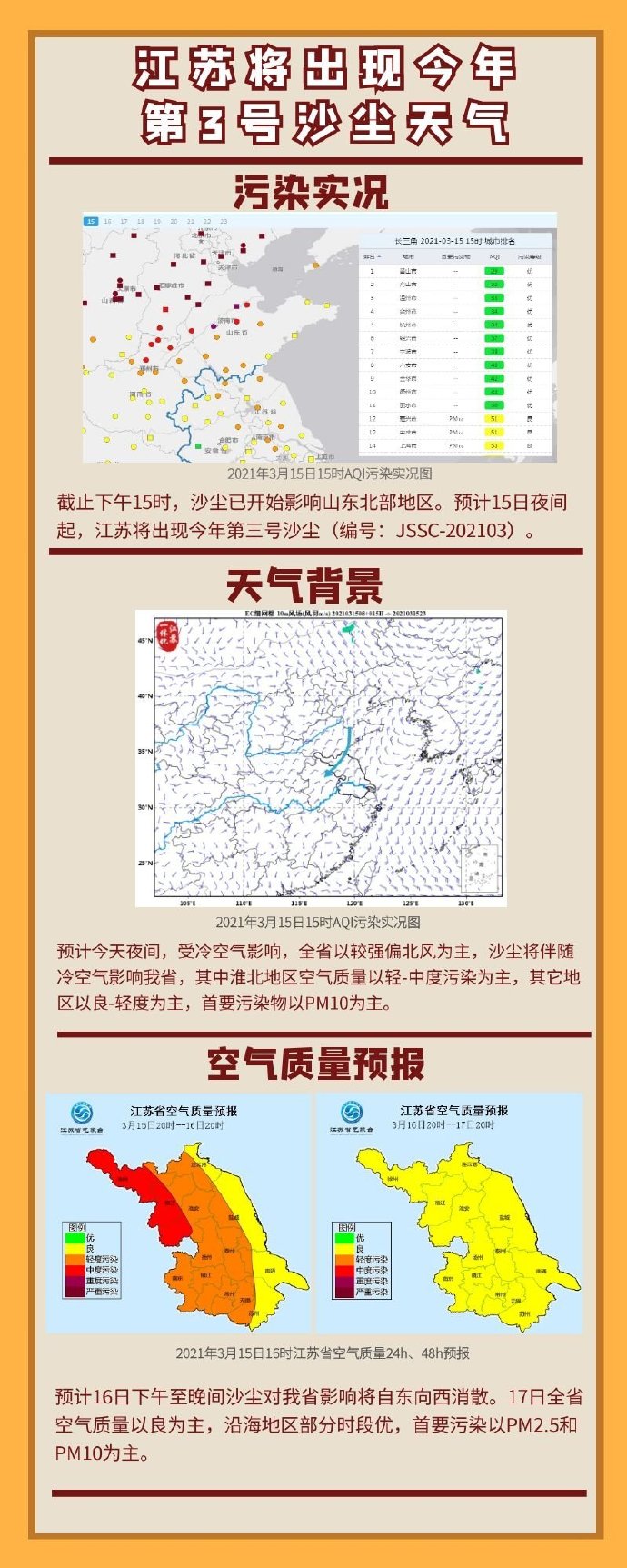 预计今天夜间,受冷空气影响,江苏省以较强偏北风为主,沙尘将伴随冷空气影响江苏省,其中淮北地区空气质量以轻-中度污染为主,其他地区以良-轻度为主,首要污染物以PM10为主。预计16日下午至晚间,沙尘对江苏省影响将自东向西消散。17日全省空气质量以良为主,沿海地区部分时段优,首要污染以PM2.5和PM10为主。
