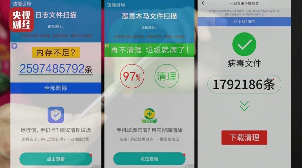 70多岁的李女士通过智能手机看新闻、小说时,手机屏幕总会自动蹦出一些“安全提示”:“病毒”“垃圾”“内存严重不足”,按照提示李女士清理了手机,但她发现这些“安全提示”越清理越多,手机越用越慢。