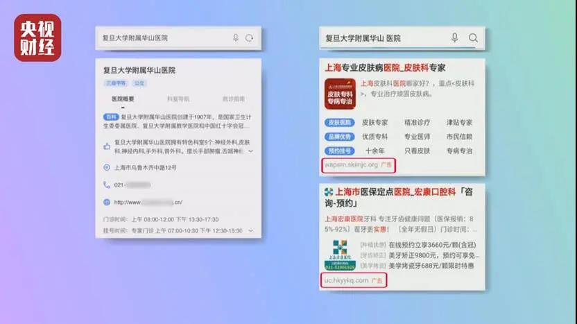 搜索复旦大学附属华山医院,前几条就是包括医院官网在内的相关网站。但是在华山和医院中敲击空格,继续搜索,结果却是大相径庭,排在前几位的都是其他医院的广告。