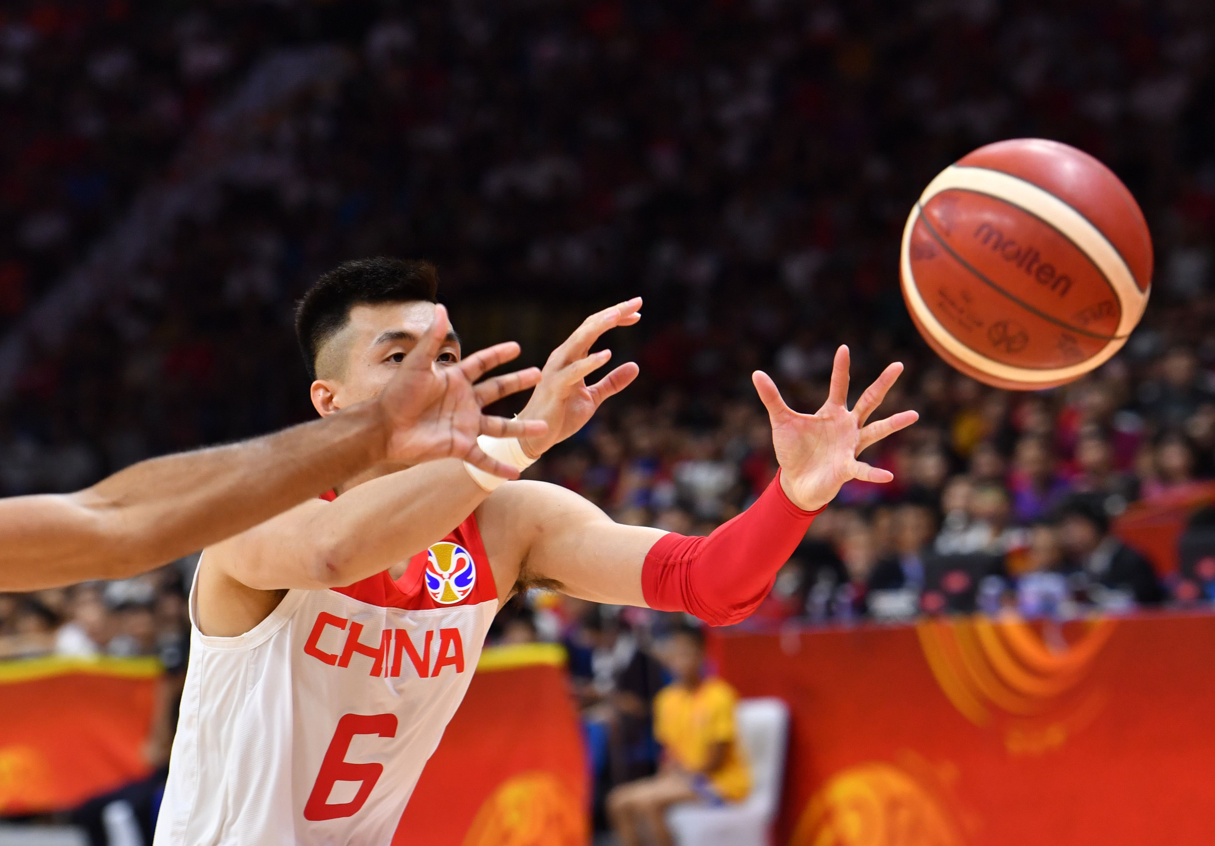 2019年9月8日,中国队球员郭艾伦在比赛中接球。新华社记者贺长山摄