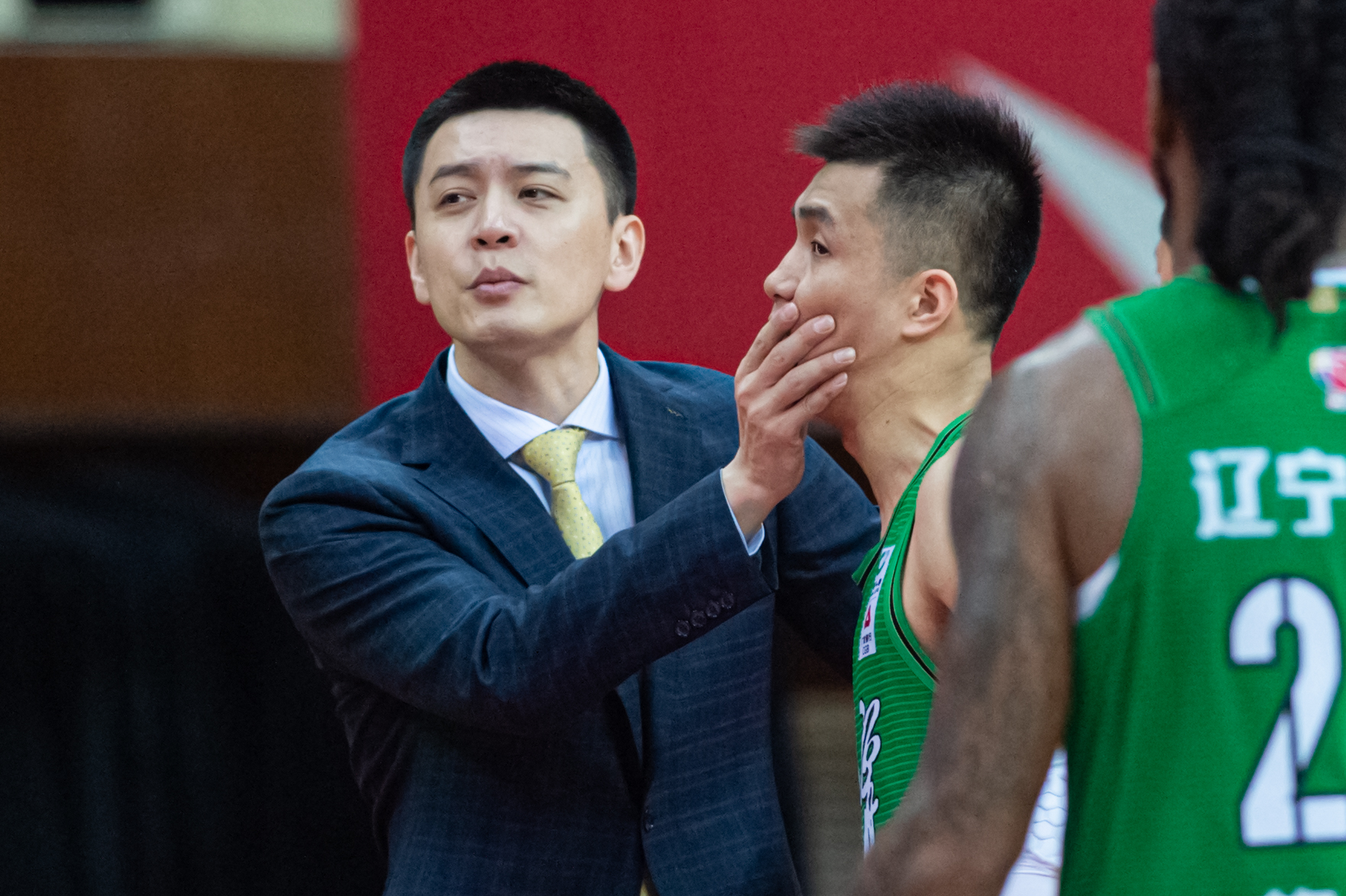 2021年3月10日,辽宁本钢队球员郭艾伦(右)在比赛中质疑裁判被判罚技术犯规后,主教练杨鸣捂住他的嘴巴示意不要争辩。新华社记者 江汉 摄