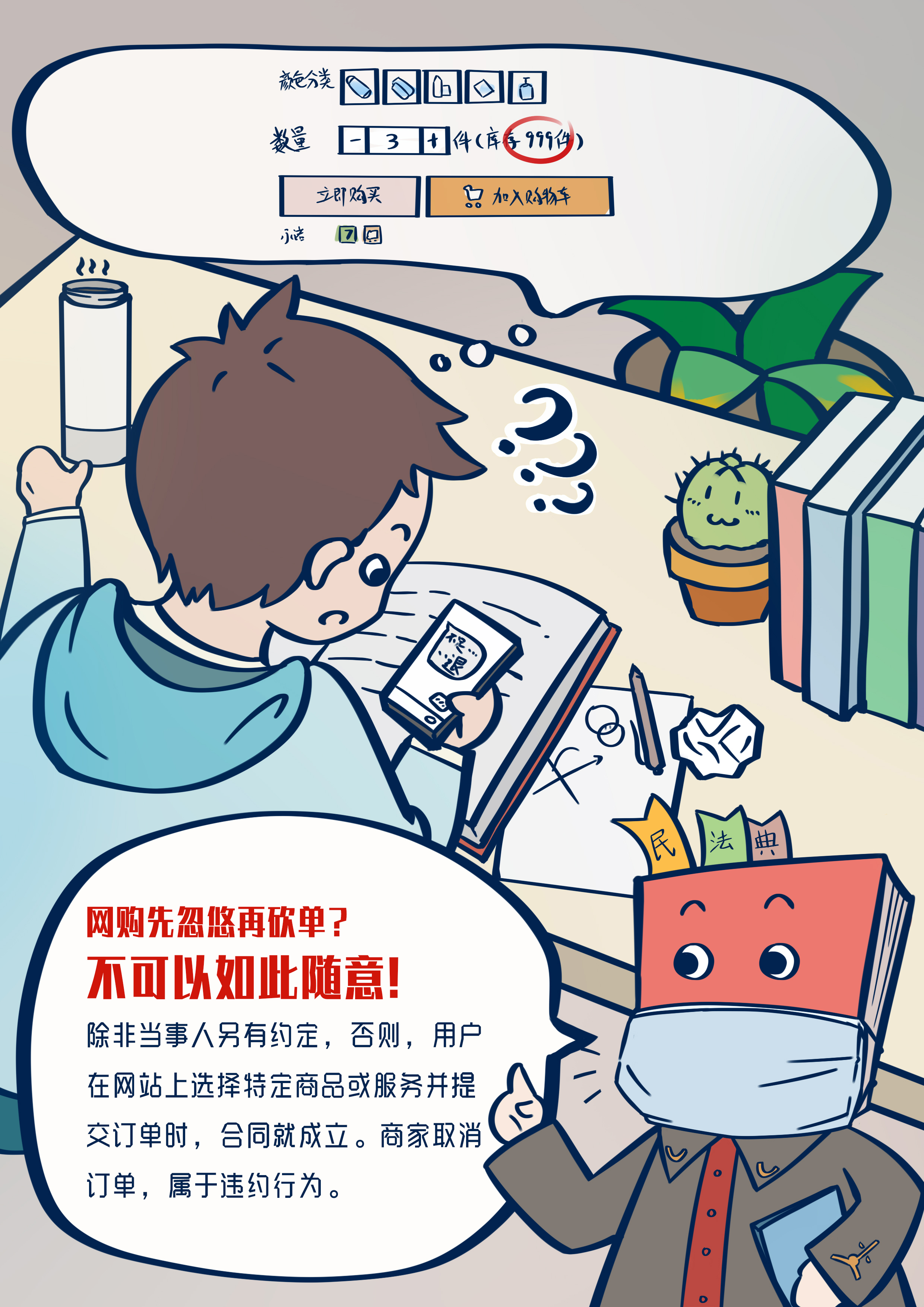 【一“典”就通】安徽神州行律师事务所律师张友煌表示,消费者在下单前可以重点关注电商平台关于合同成立时间的规定,除非当事人另有约定,否则,网络用户在网站上选择特定商品或服务并提交订单时,合同就成立。商家不得主张因为其没有存货等原因而合同没有成立。商家取消订单,属于违约行为,应当承担违约责任。